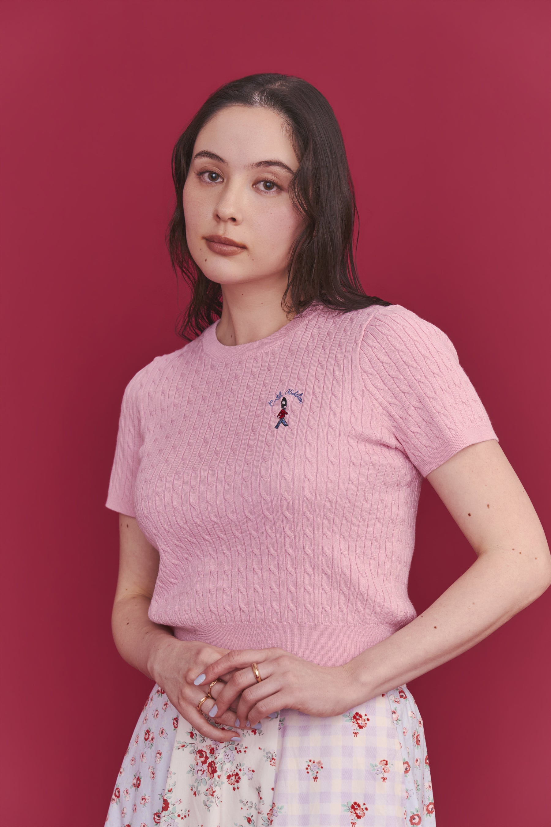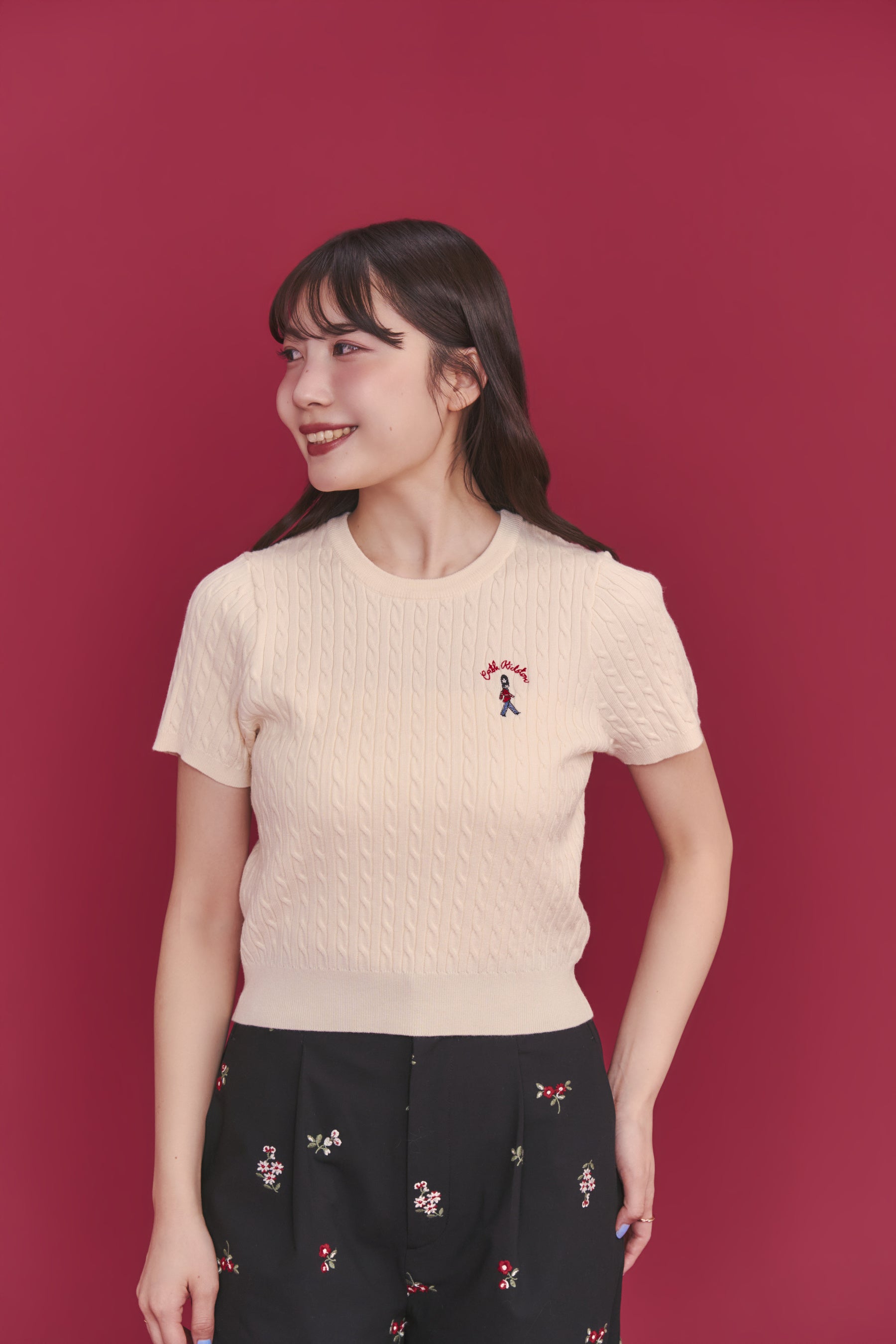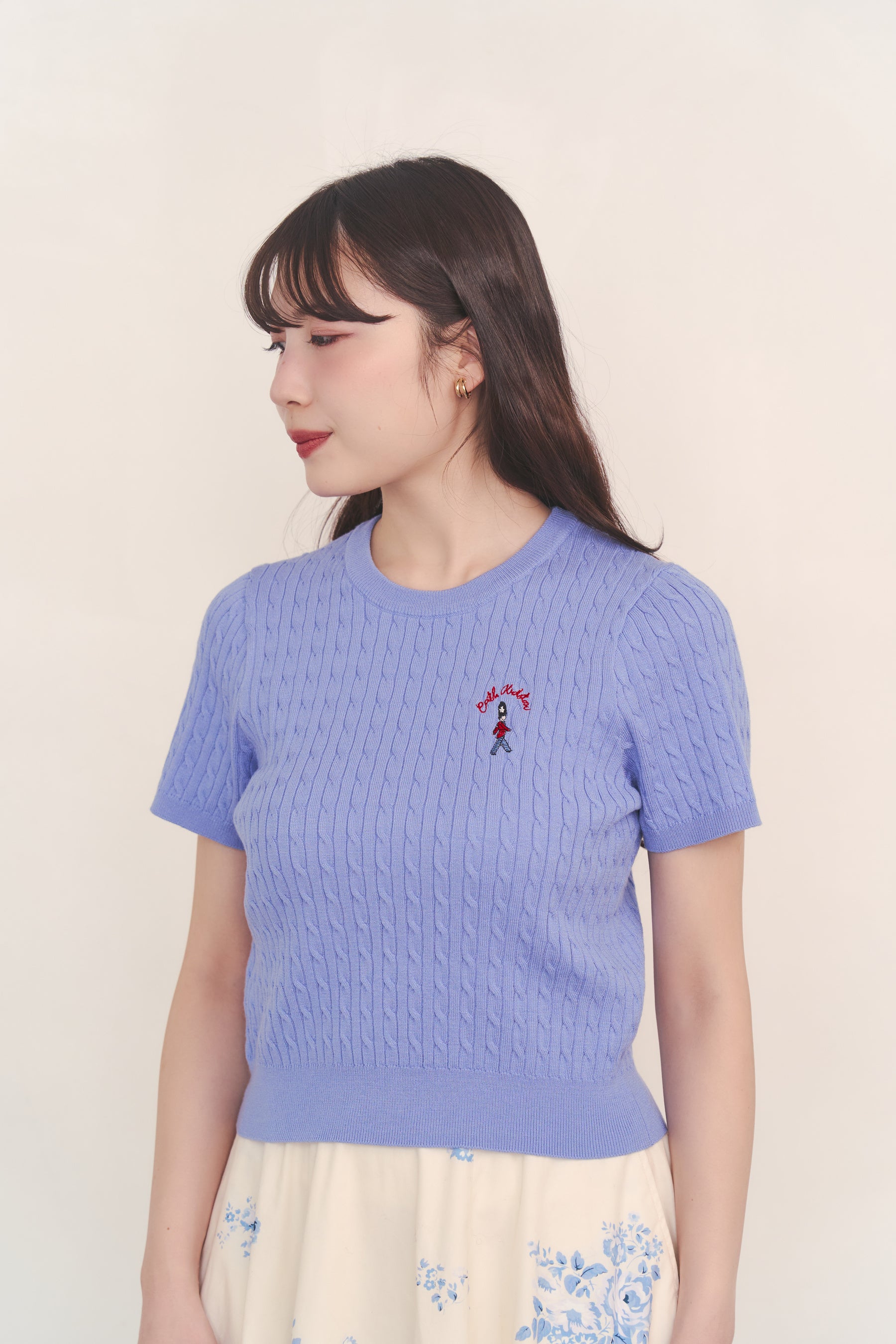 ●人気のショートスリーブニットが春夏仕様で登場。「ショートスリーブライトニットトップス Queenie‘s London」は前回のモデルよりも編み目を細かくしたケーブル編みで、よりクリーンで洗練された印象を楽しむことができます。Cath Kidston らしいロンドンの兵隊を胸元に、リボンの刺繍を後ろの襟元に施しました。ニットカーディガンジャケットと合わせれば、アンサンブル風の着こなしに。ボリュームフレアスカートともコーディネートを楽しめるカラー展開です。キッズで展開している兵隊柄刺繍のカーディガンと、親子お揃いコーデも楽しめます。