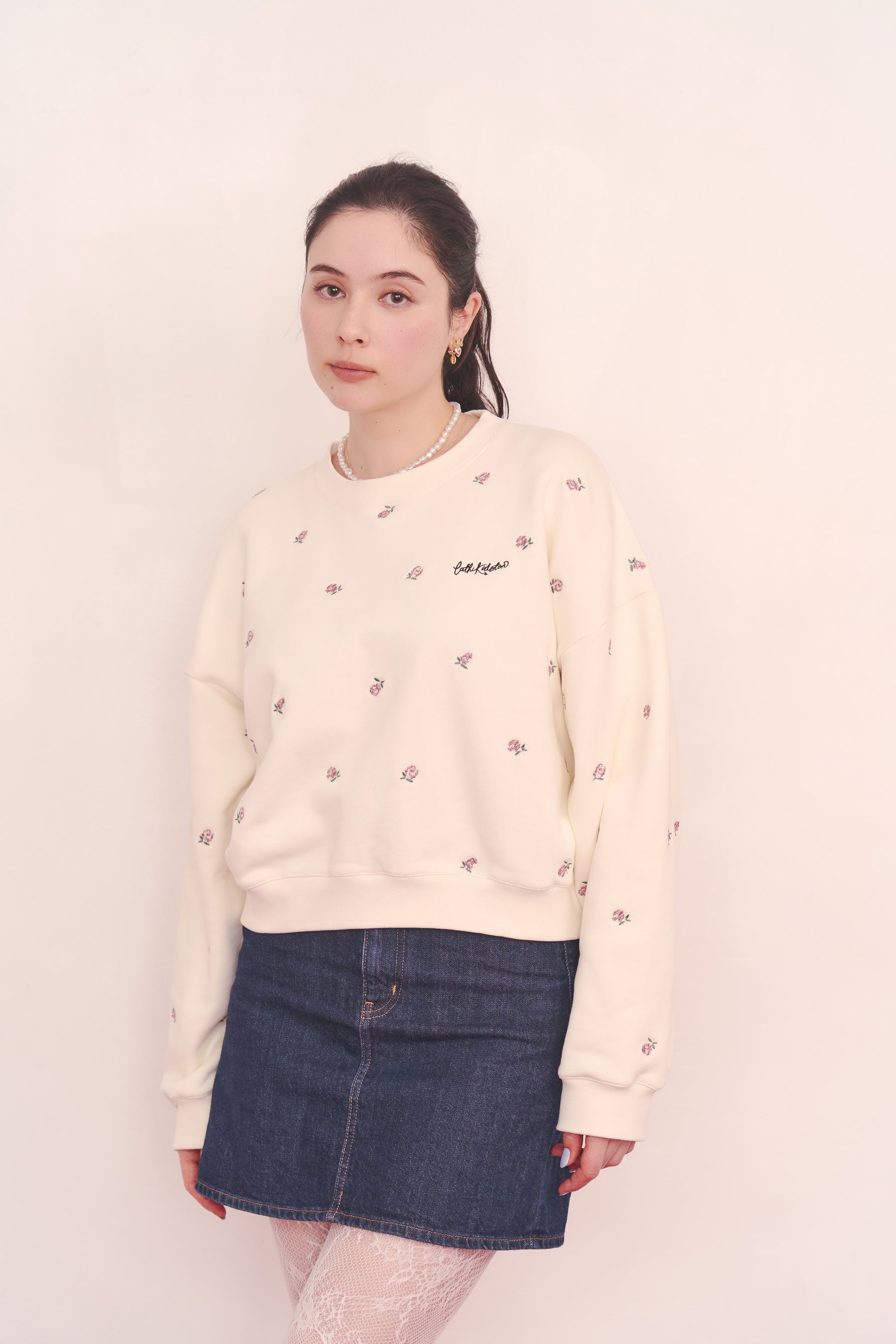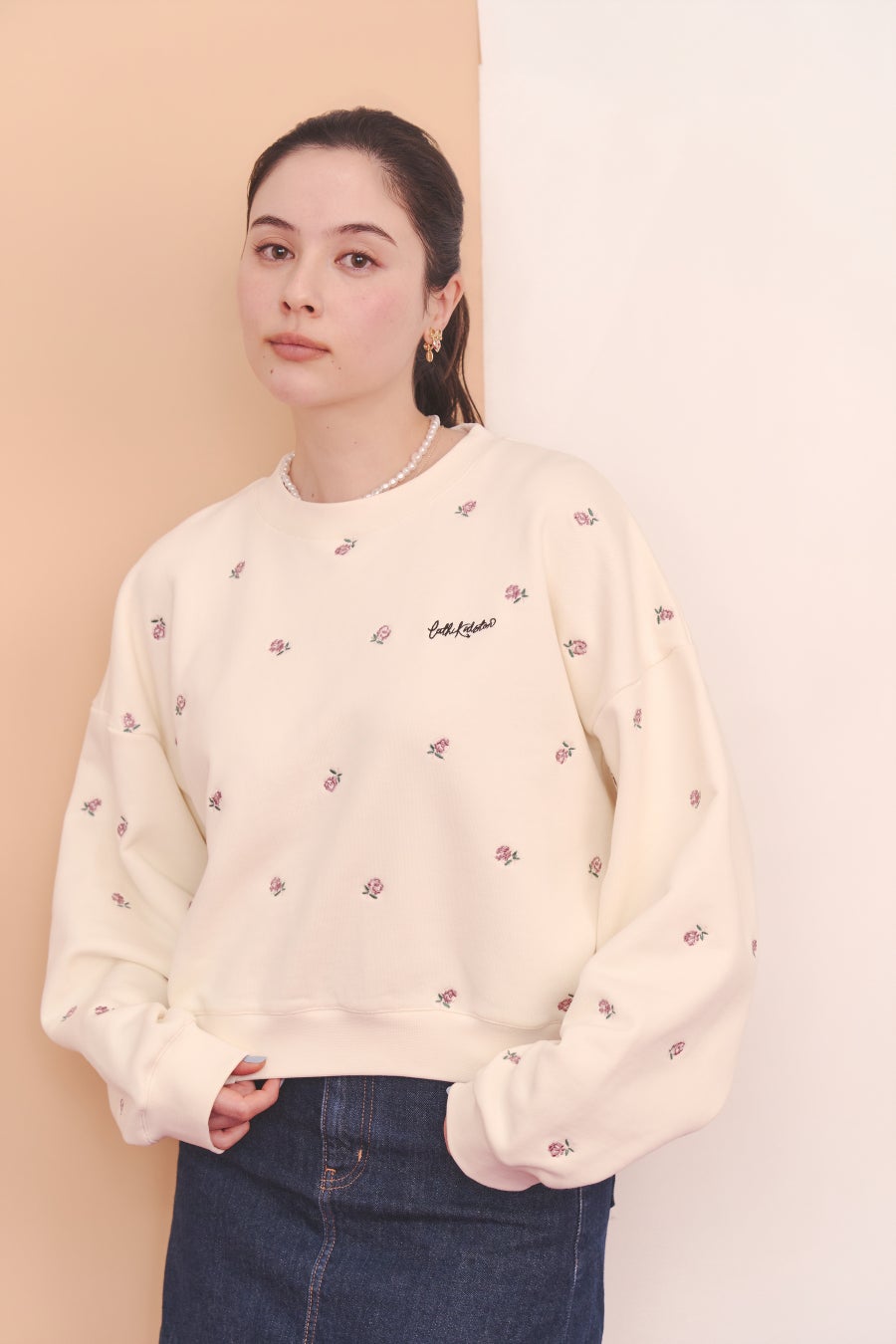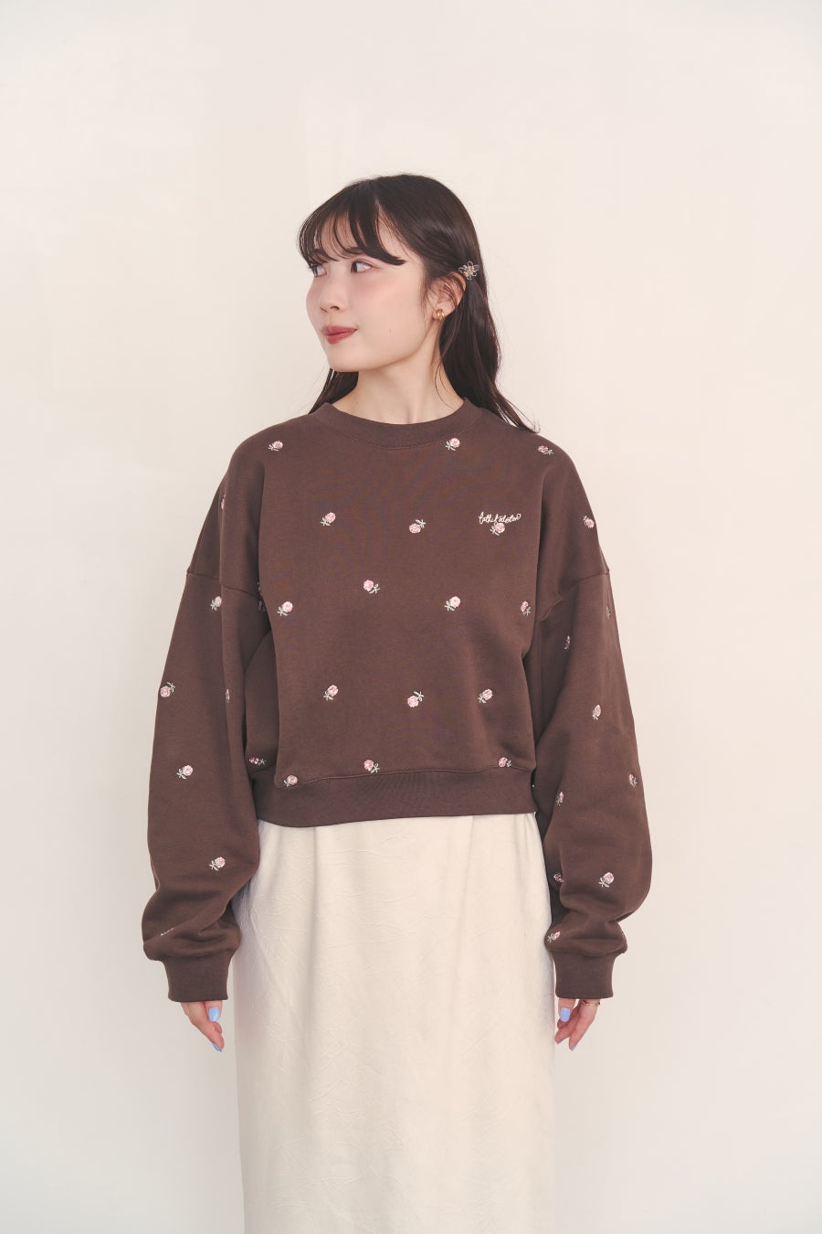 ●「総柄刺繍スウェットトップス Rose Embroidery」は刺繍をニュアンスカラーでまとめ、甘すぎない雰囲気に仕上げました。ショート丈で袖周りをゆったりさせることで、ルーズな抜け感を演出。いつものスウェットスタイルを今っぽくスタイリッシュにアップデートしてくれるアイテムです。
