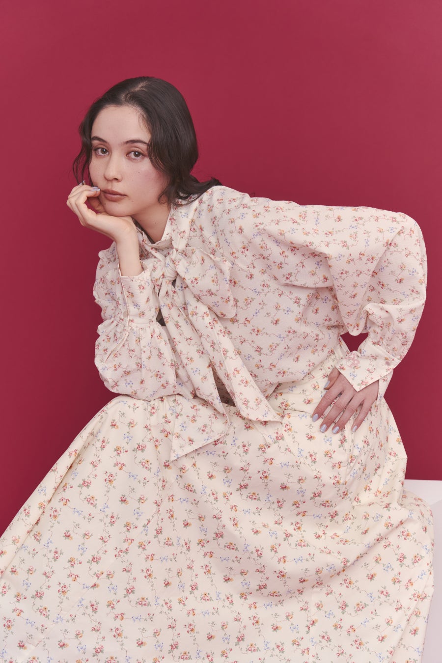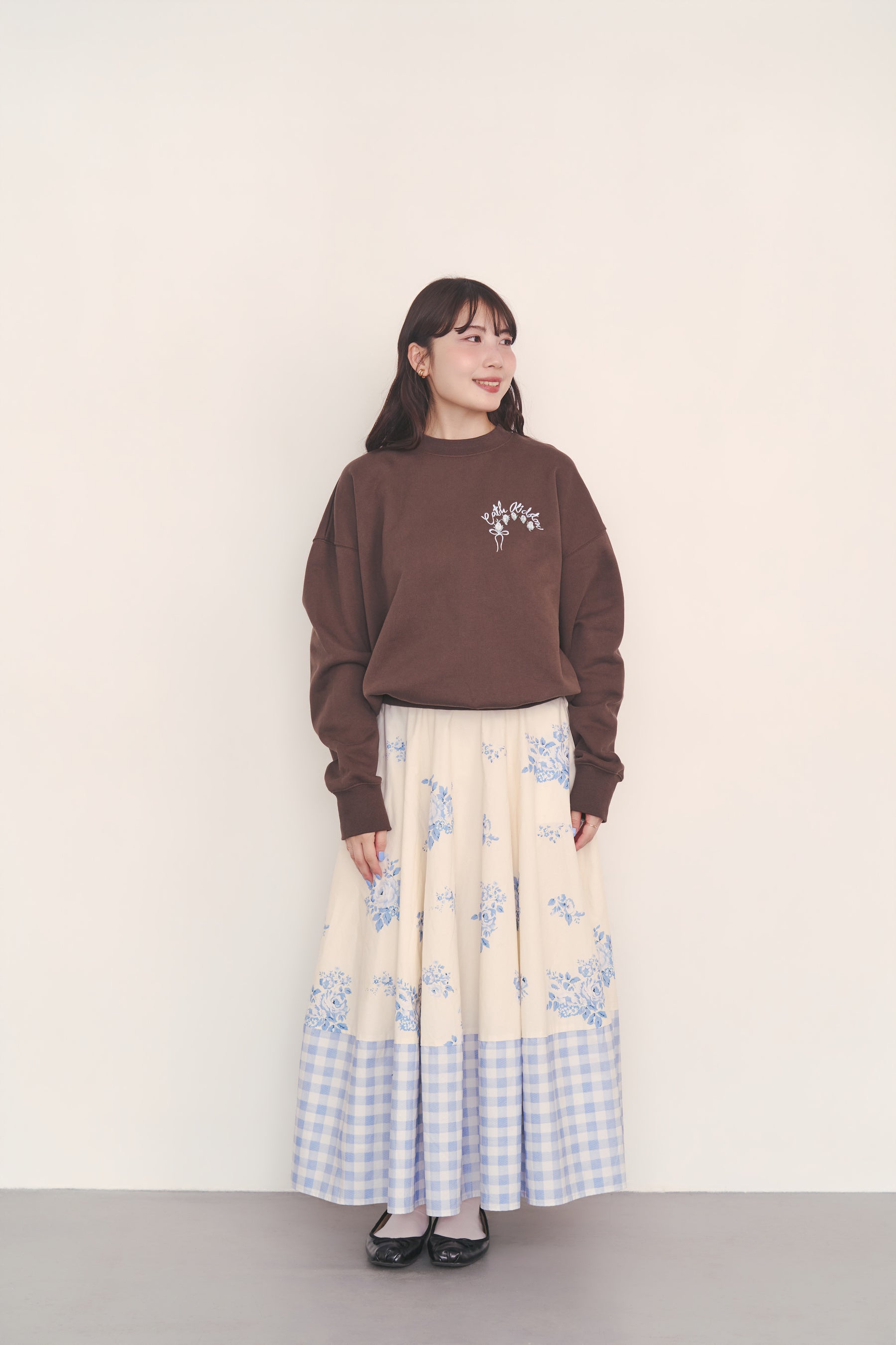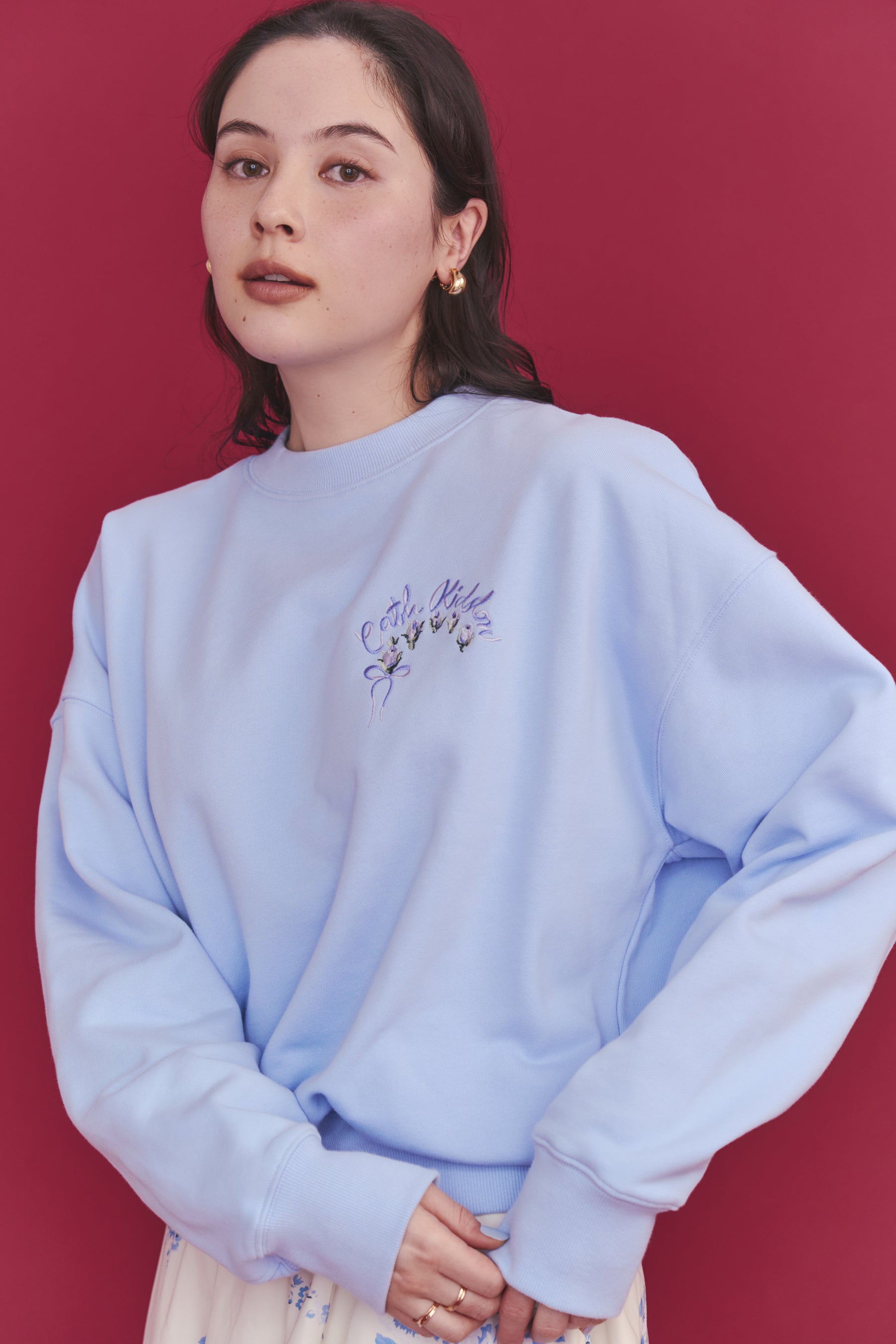 ●「総柄刺繍スウェットトップス Rose Embroidery」は刺繍をニュアンスカラーでまとめ、甘すぎない雰囲気に仕上げました。ショート丈で袖周りをゆったりさせることで、ルーズな抜け感を演出。いつものスウェットスタイルを今っぽくスタイリッシュにアップデートしてくれるアイテムです。