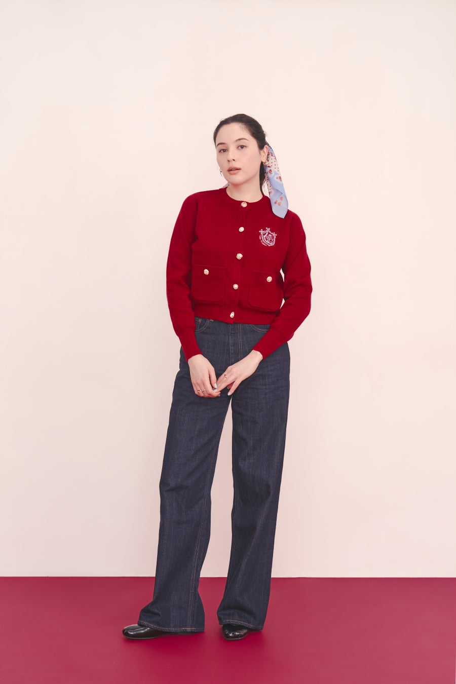◇刺繍ニットカーディガンジャケット Love Notes Ivory / Navy / Red / Gray / Sax 各13,200円(税込)