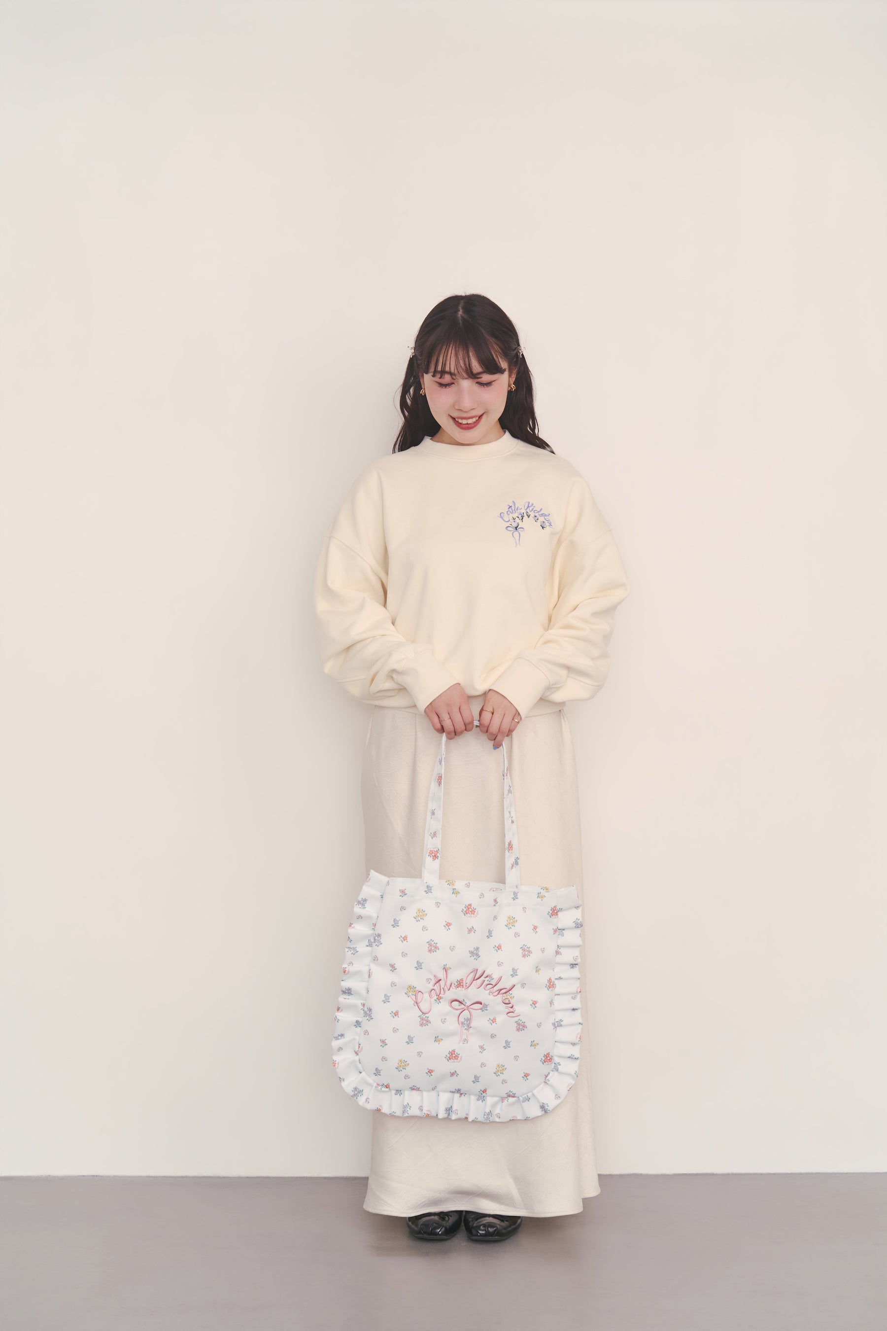 ◇刺繍スウェットトップス Ribbon Floral Ivory / Light pink / Brown / Sax 各8,800円(税込)