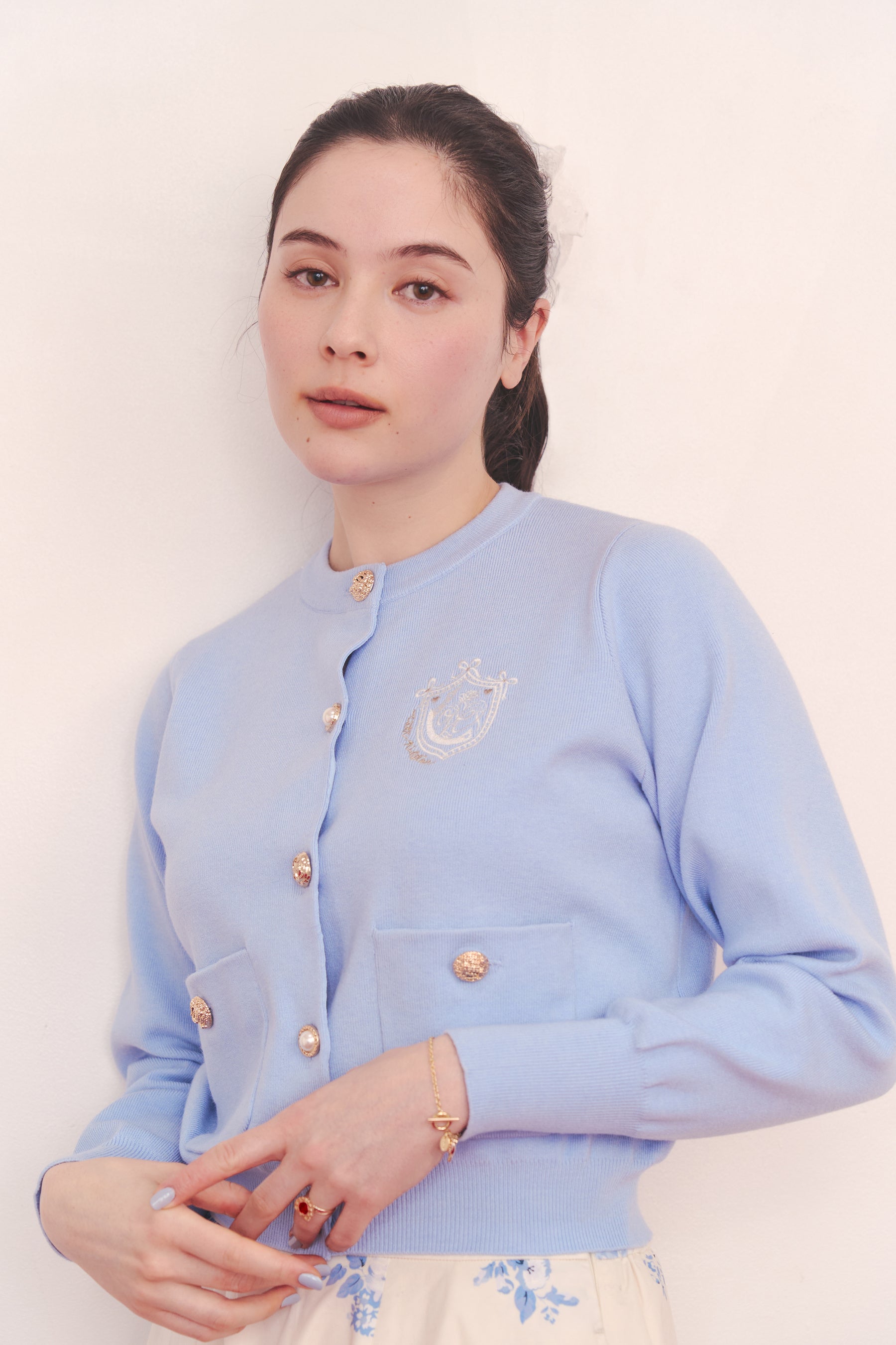 ●「刺繍ニットカーディガンジャケット Love Notes」はトレンドのジャケット型シルエットで仕立てた上品なニットカーディガン。 新デザインのエンブレム刺繍が、落ち着いた大人の可愛さを引き立てます。こだわりは、フロントにあしらった数種類の金ボタン。表情の異なるボタンを組み合わせることで、いつものスタイルをワンランク上の着こなしに導きます。シルエットを美しく保つ程よい肉感のある、さらりと羽織れる素材なので、春先や秋口に快適にお召しいただけます。着る人を選ばないジャストなサイズ感と、肩から袖口までのなめらかなラインが、女性らしい印象をプラスします。カジュアル