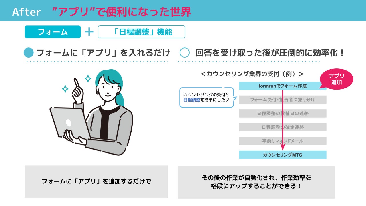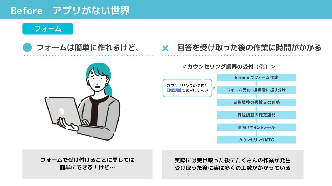 「フォームを簡単に作成できる」のみに限らず、「フォームの回答を受け取った後の作業」に該当する問い合わせ対応、日程調整、購入フローといった業務を、効率化可能な部分から段階的に自動化していきます。