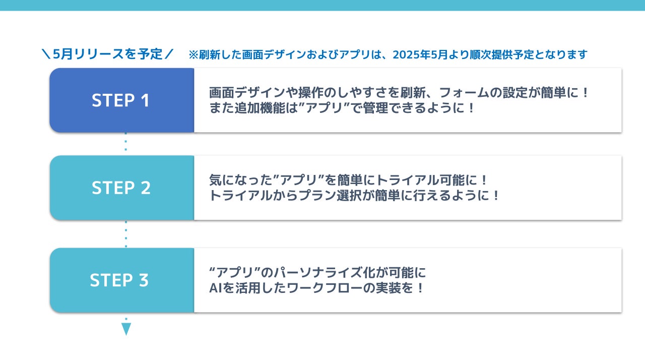 その第一歩として、画面デザインや操作のしやすさを刷新し、フォームの設定をより直感的かつ簡単に行えるよう改善を図ります。 さらに、これまで見つけにくかった追加機能を”アプリ”として整理・管理することで、必要な機能をスムーズに見つけられる新しい仕組みも導入してまいります。