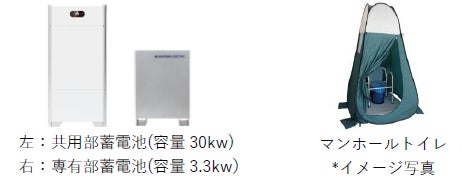 建物内には、共用部と各住戸に蓄電池を設置することで、災害時でも、太陽光発電により照明などへ電力を供給できます。専有部では、エネファームの発電と組み合わせて、停電時専用コンセントからも電力を供給できます。その他防災備蓄品やマンホールトイレも備えることで、災害時にも居住者の皆様には安心をして過ごしていただけるような計画をしております。