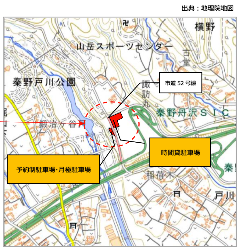 当駐車場は、バーベキューや自然観察を楽しめる県立秦野戸川公園に隣接するとともに、丹沢登山の入口にも近く、秦野市の観光利用に便利です。