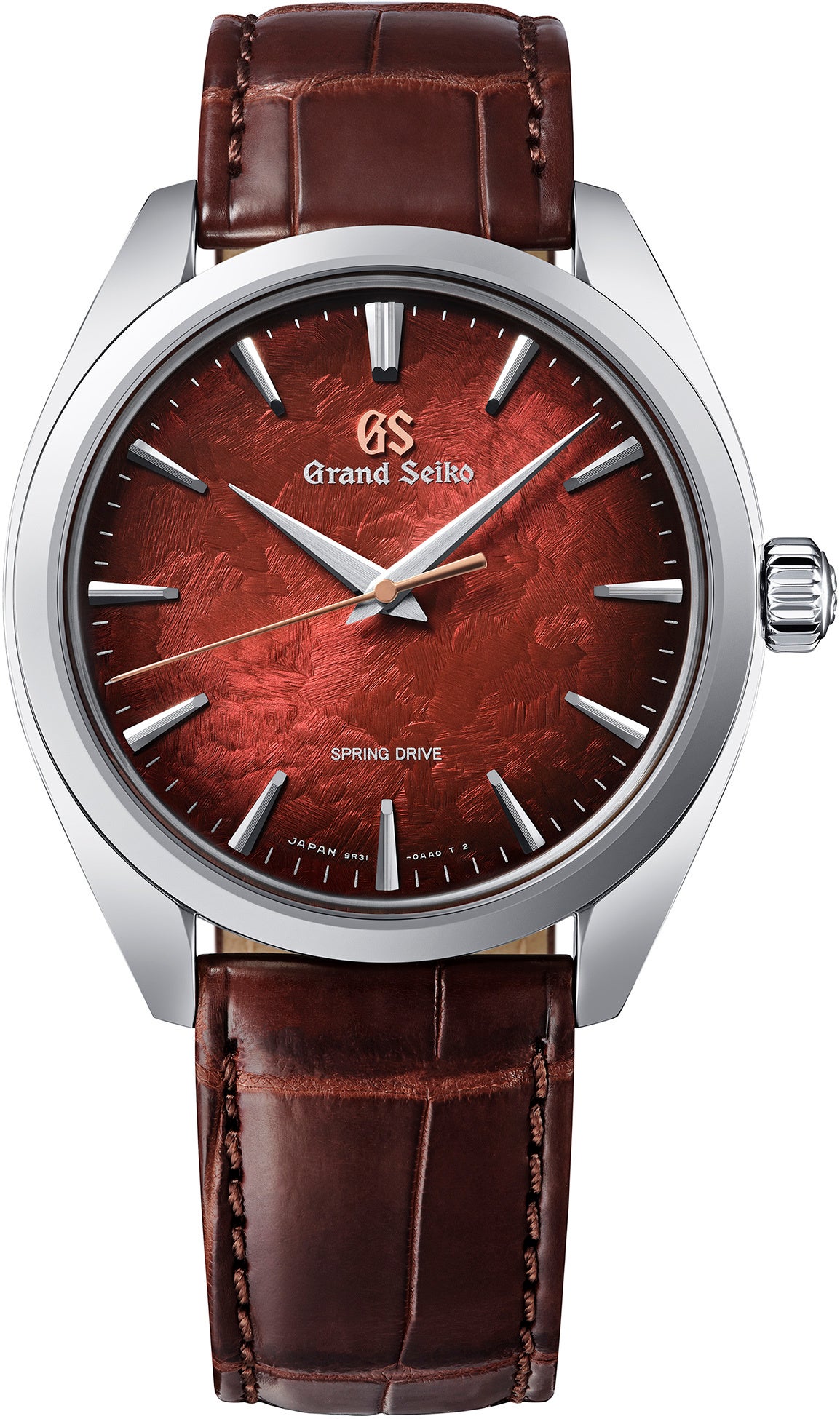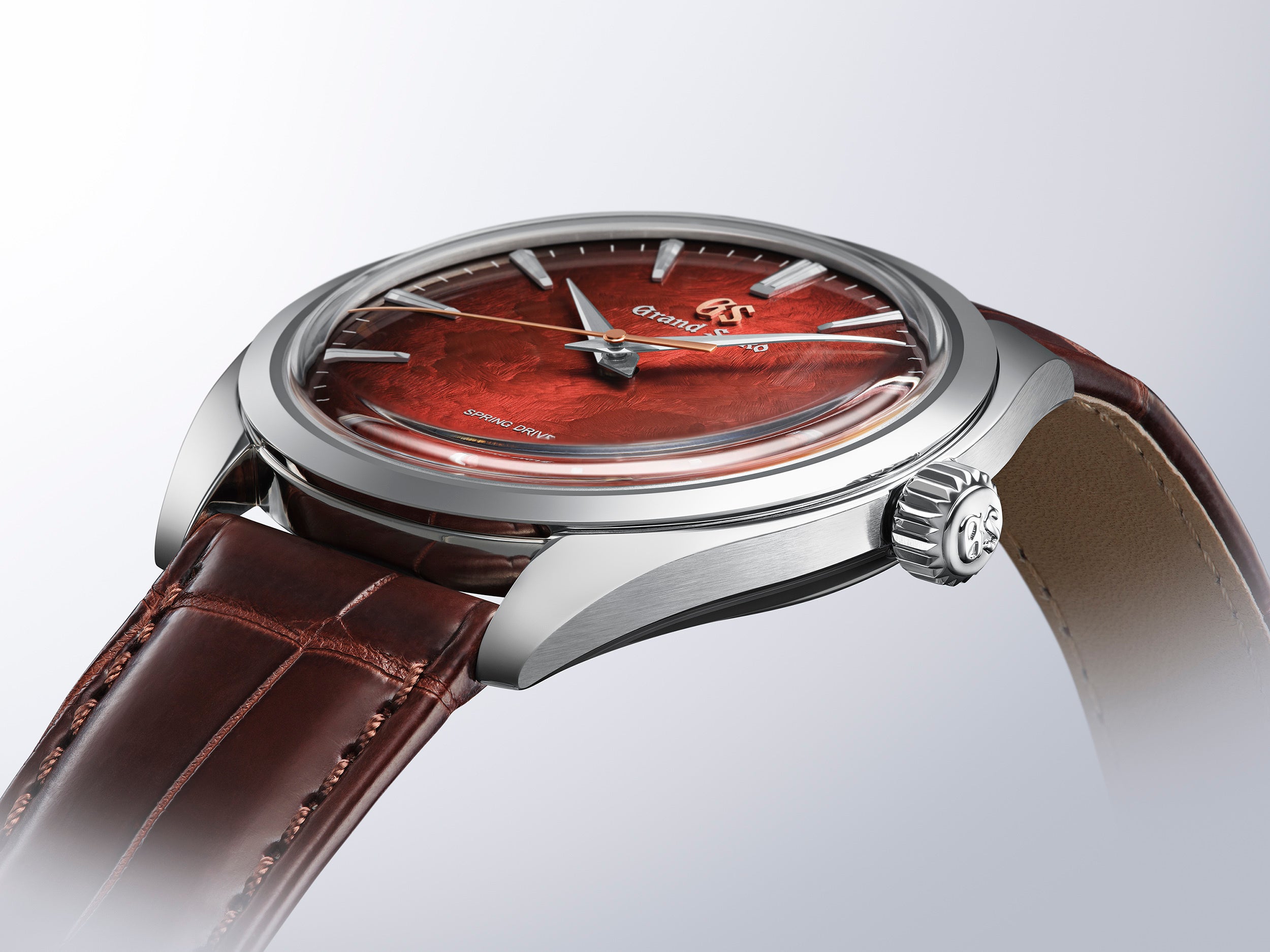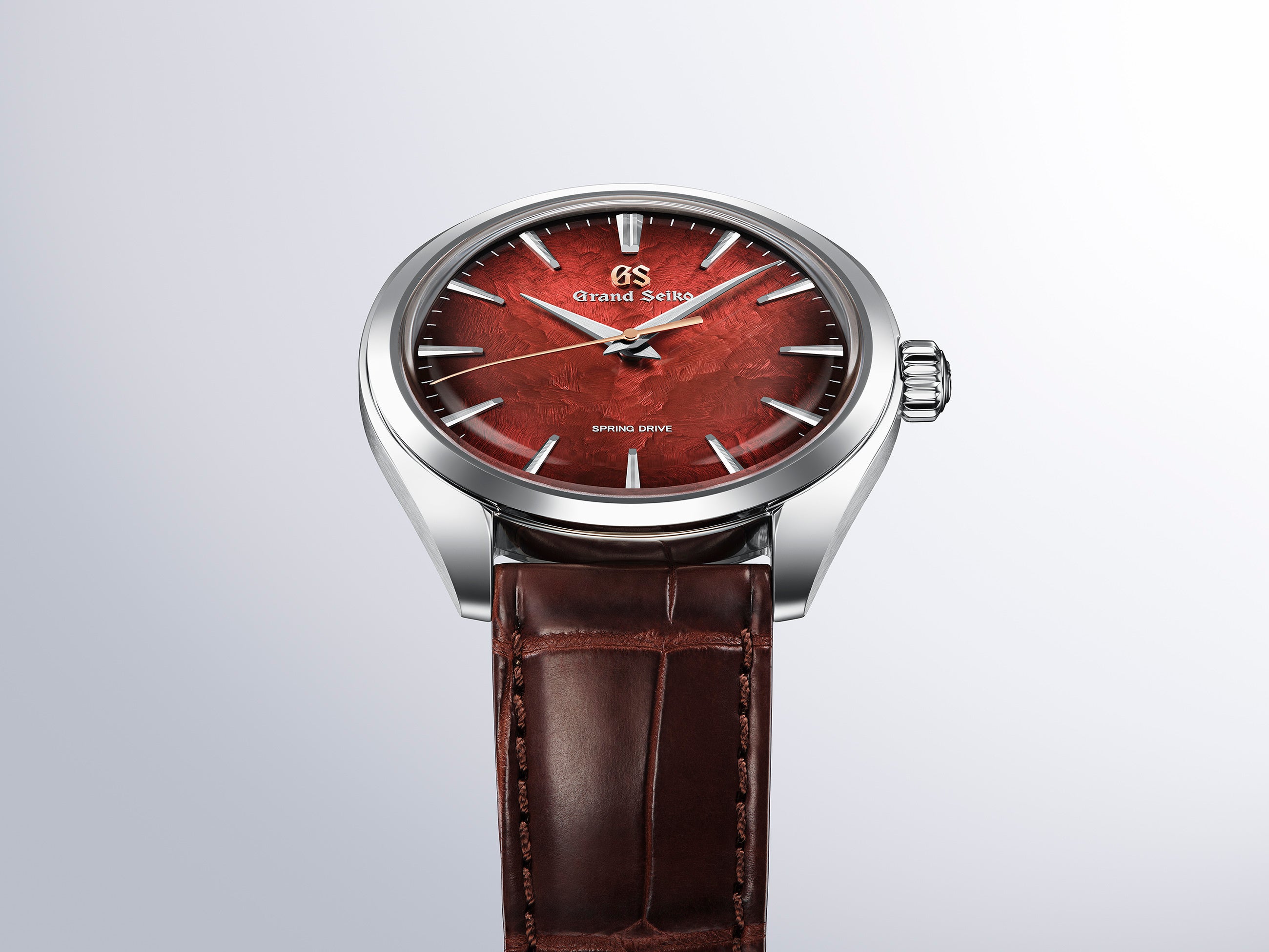 グランドセイコーらしいめりはりと曲面美を併せ持つケース、夜から朝へと向かう、時の流れとともに変わりゆく情景を表現したダイヤル、そして赤みがかった茶色のクロコダイルストラップを組み合わせることで、荘厳な穂高連峰の秋のひとときを映し出しています。