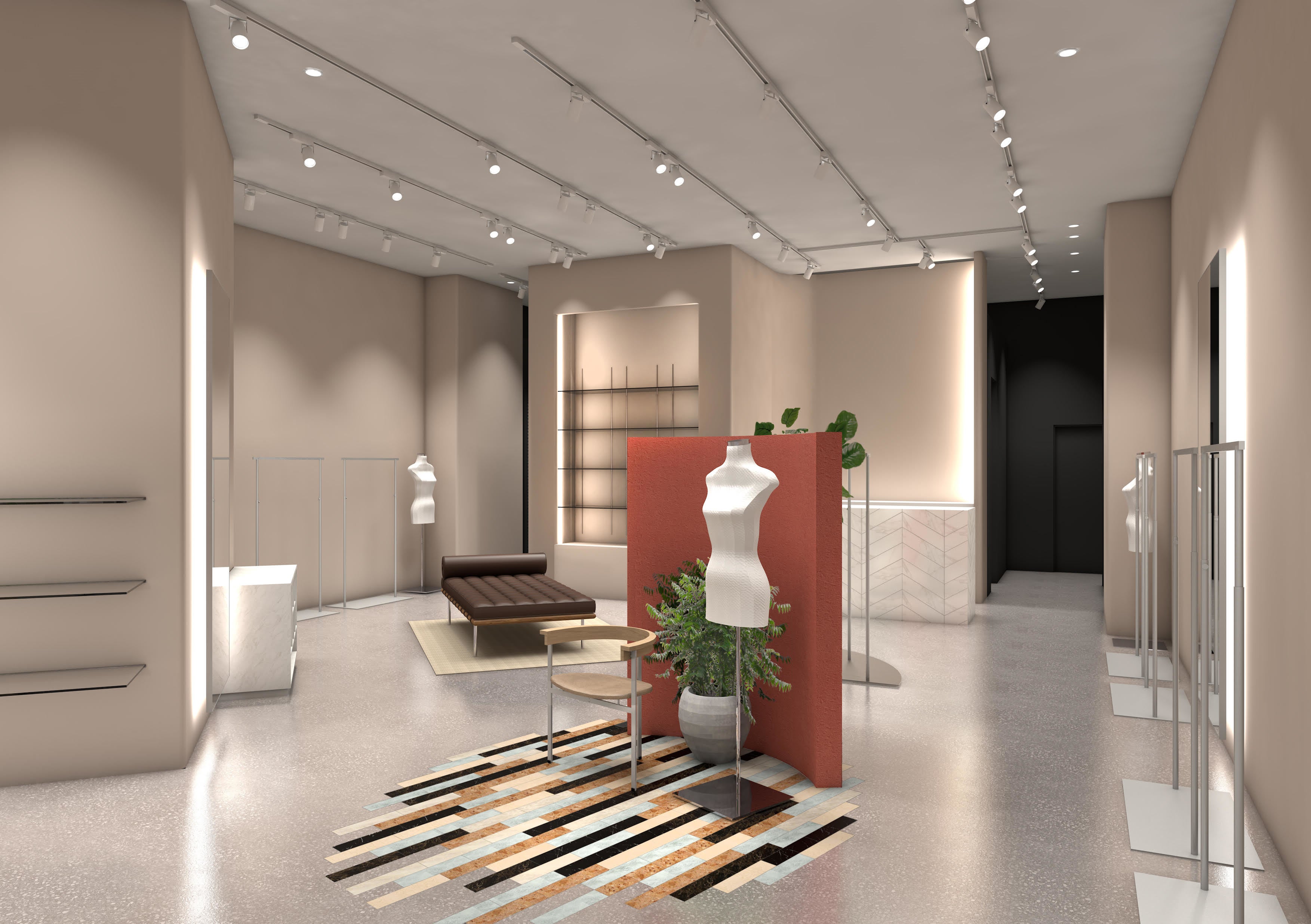 ベージュを基調とした広々とした店内は、テラコッタの壁を配したウィンドウスペース、大理石タイルのカウンター、大理石調のフローリングを施したディスプレイスペースなどをアクセントとして取り入れ、モダンでありながらリュクスなムードを融合した内装となっています。