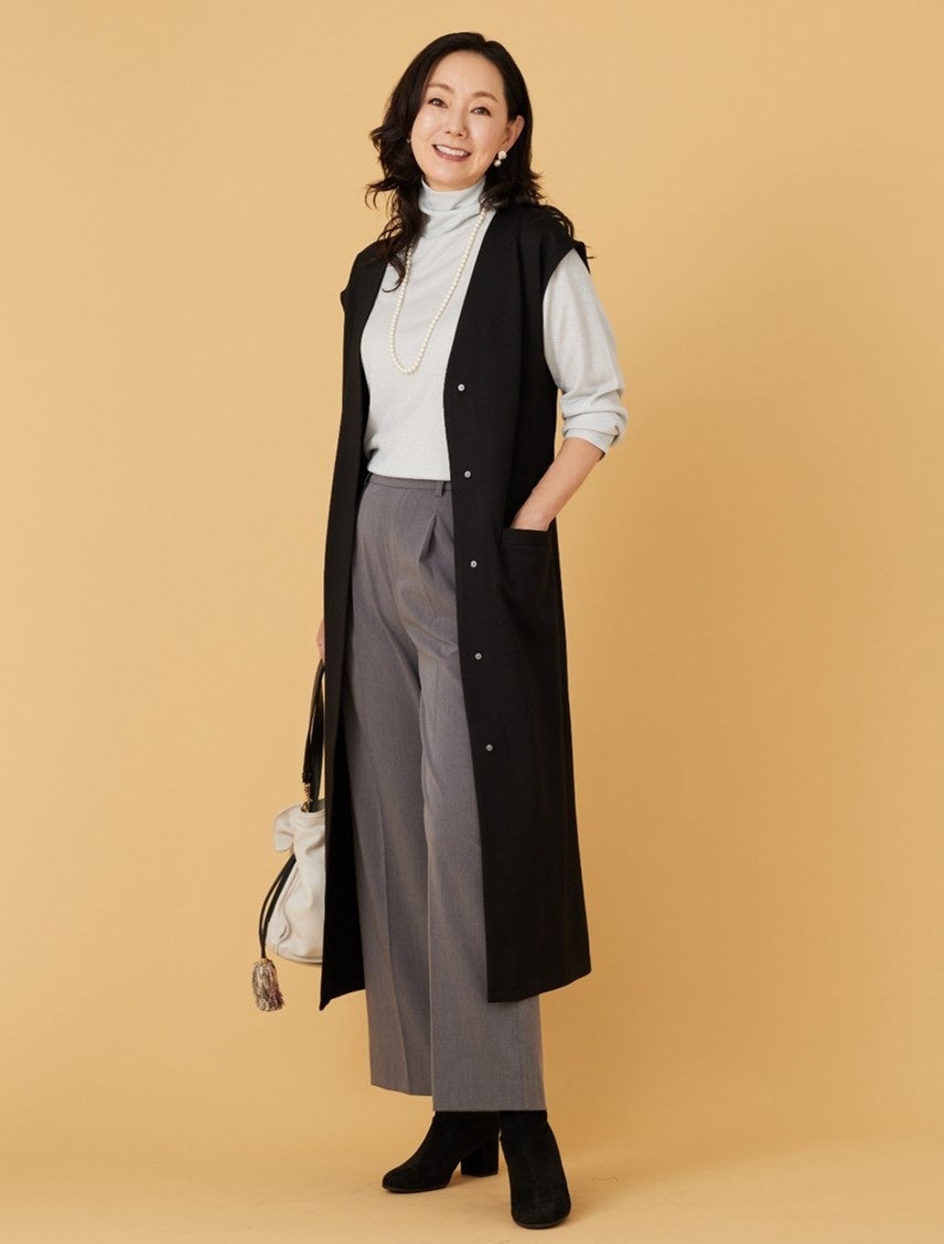 ■特長:ロングシルエットでスラっと縦ラインを強調してくれるモードなジレ。後ろ衿のVネックデザインが後ろ姿までさらにきりっと美しく演出してくれます。なめらかなポンチ素材で高見え力抜群の1着です。