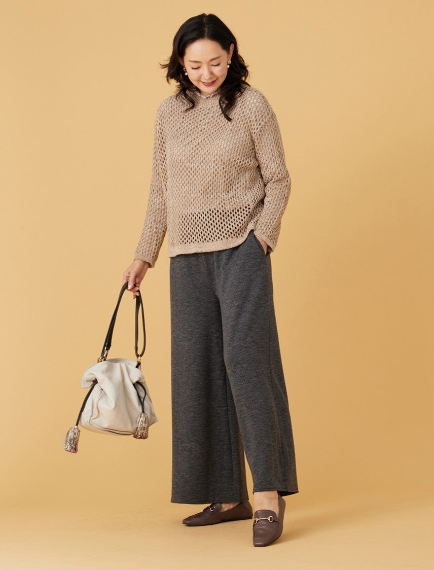 ■特長:スラっと美脚に見える絶妙なワイドシルエットのパンツ。「<とよた真帆コラボ>Vネックプルオーバー」とセットアップで合わせて着るのがおすすめです。とろけるような風合いで伸びが良く、ずっと着ていたくなるような着心地のアイテムです。