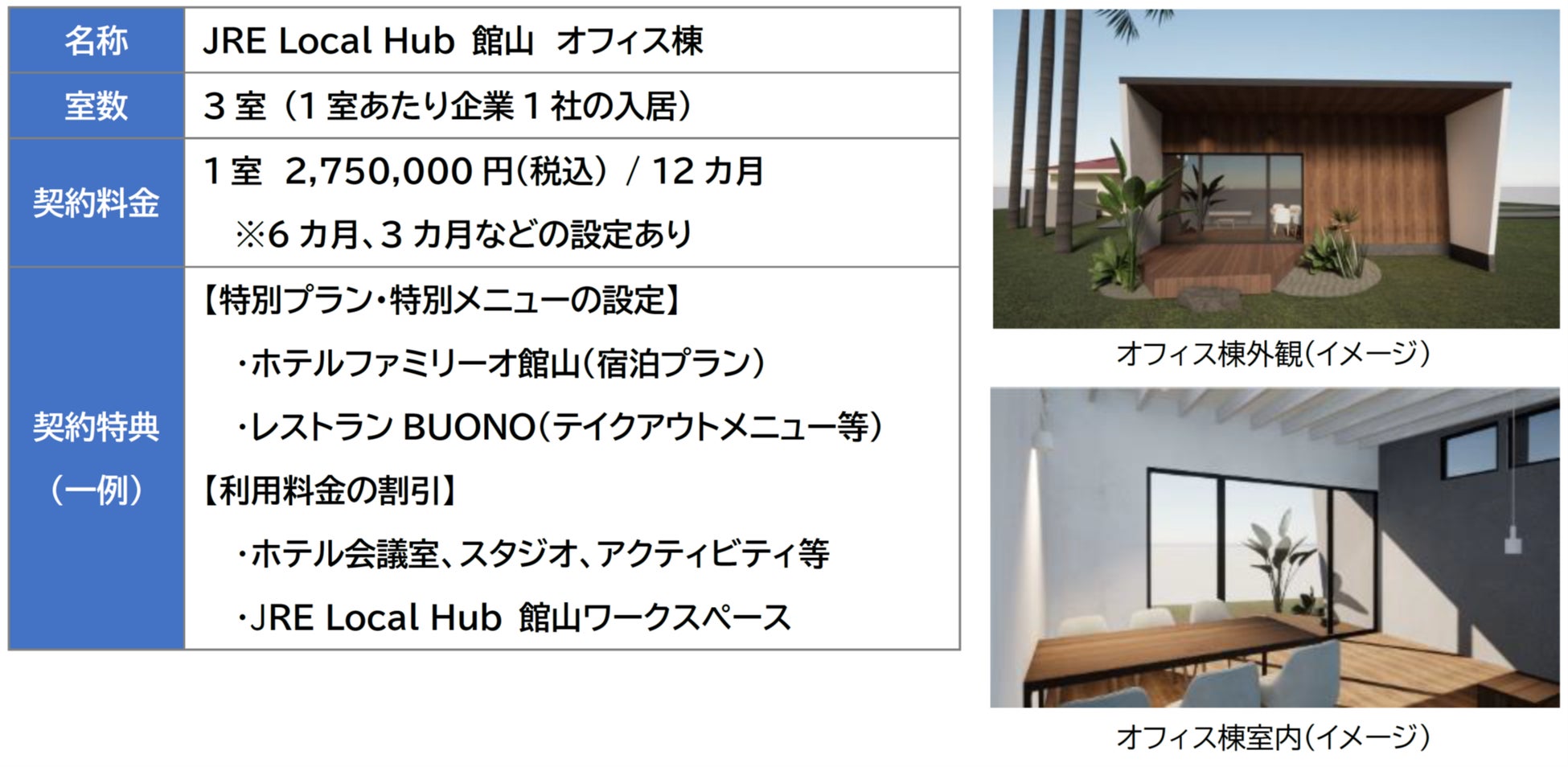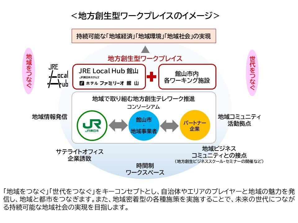 具体的には、今回整備する地方創生型ワークプレイス「JRE Local Hub 館山」を拠点として、サテライトオフィス等の企業誘致、館山市内の各ワーキング施設との連携による市内外に開かれたワークスペースの実現、地域ビジネスコミュニティとの接点となるセミナー、スクールやワークショップを開催します。