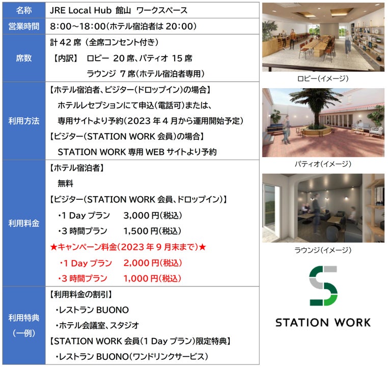 ホテルご宿泊のお客さまはもちろん、オフィス棟契約事業者やビジター(ドロップイン)のお客さま、さらにJR東日本のシェアオフィス事業「STATION WORK」との連携により、館山エリア内外のテレワーカーに開かれたワークスペースを実現します。