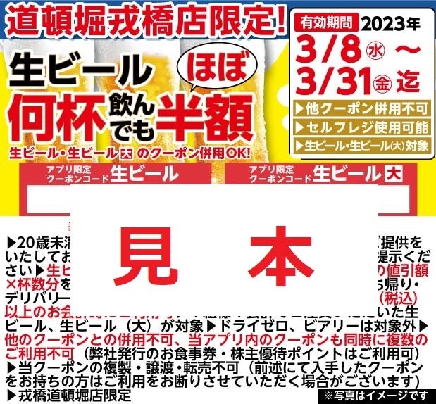 戎橋店」をお気に入り店舗とすると、3月31日(金)まで道頓堀戎橋店のみで利用できるクーポンが