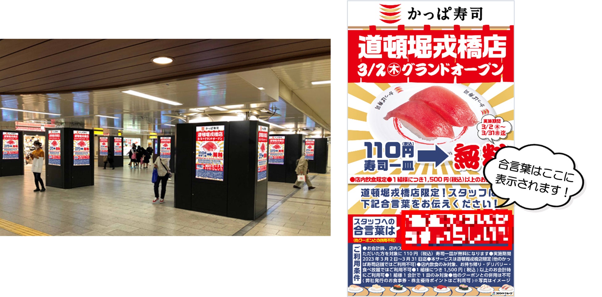 Campaign③:店内飲食限定 スタッフに合言葉を伝えたら110円(税込)寿司を一皿無料!