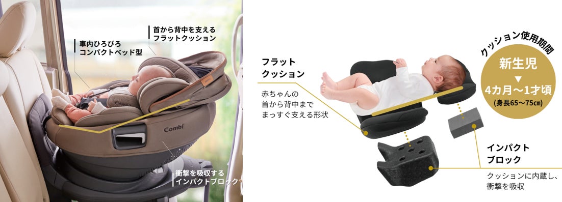 今回新たに、赤ちゃんの首から背中までをまっすぐ支える、新形状のインナークッション「フラットクッション」を搭載。成長に合わせて取り外し時期を選べる設計です。
