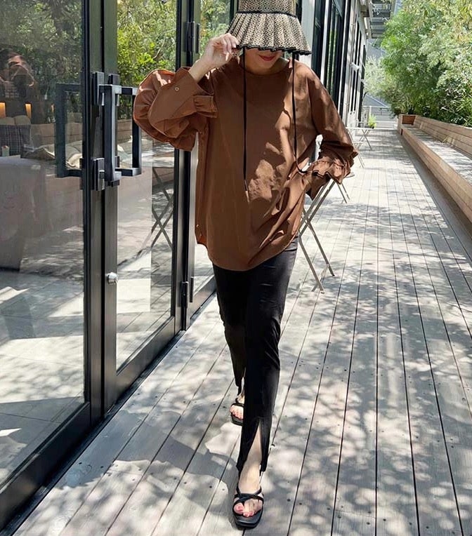 人気インフルエンサーとのコラボアイテム。トレンドライクなフリル袖のトップス&センタースリット入りのパンツは、デイリーユースにもぴったり。