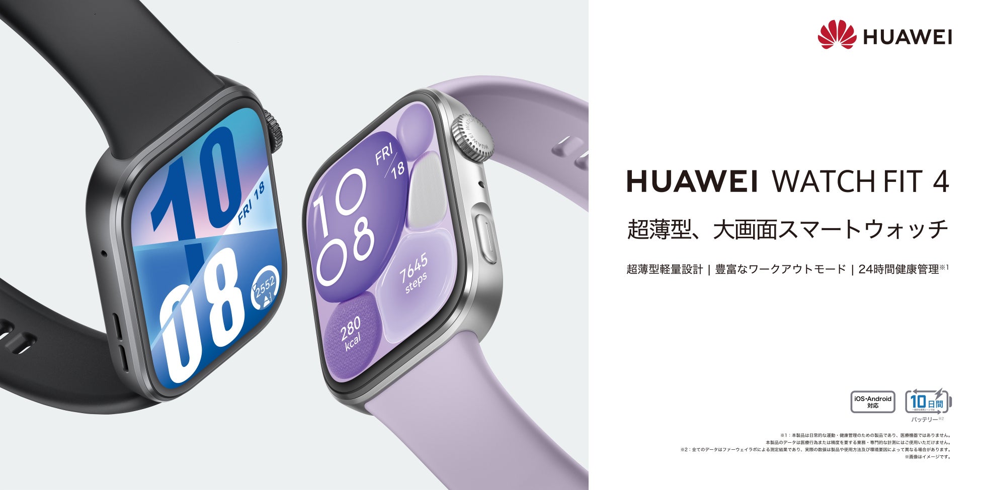 『HUAWEI WATCH FIT 4』は、手に取りやすいお手頃価格ながら、薄型軽量の見やすい大画面と多彩な機能を搭載するスタイリッシュなスマートウォッチシリーズ「HUAWEI WATCH FIT」の最新モデルです。