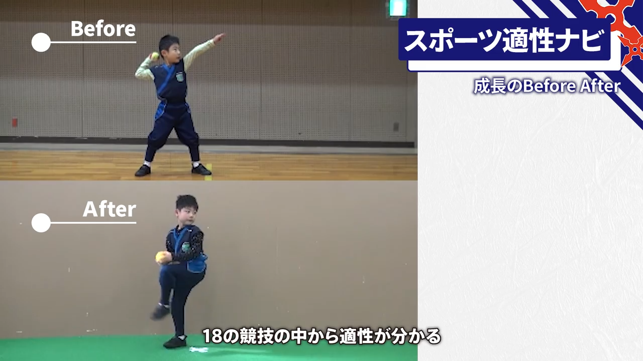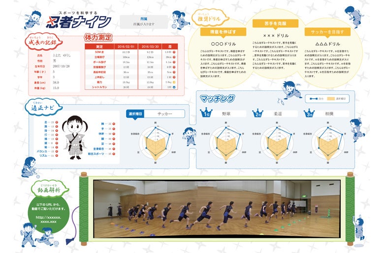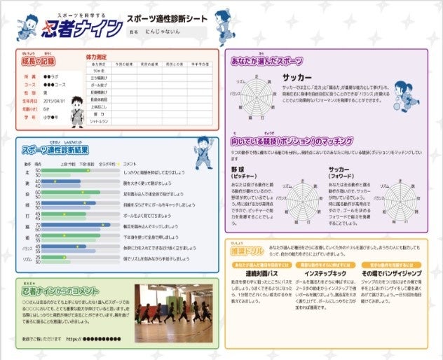 忍者ナインの「スポーツ適性ナビ」は、動作分析シミュレーションシステムを用いて、お子さまの現在の運動能力を60段階で「見える化」した帳票です。さまざまなプロスポーツ選手の分析結果データと照合し、どんな競技に向いているかも診断します。この「スポーツ適性ナビ」の目的は、子どもたちが自分の成長を実感することで、達成感や自信を育み、次の目標へのチカラに変えること。定期的に実施することで、成長をご確認いただけます。一人ひとりの才能を磨く忍者ナインのオリジナルプログラムです。