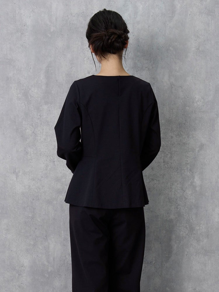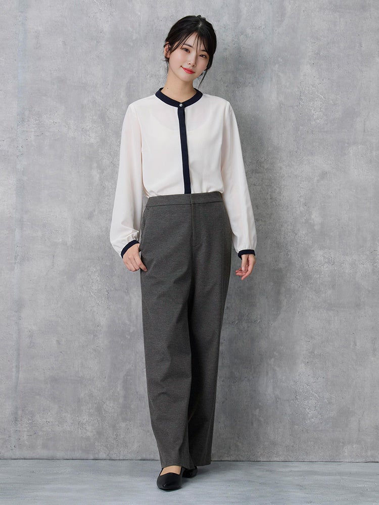 ④ ノーカラーのV字ラインは首に沿うようにやや立ち襟シルエットで、首回りをシャープな印象に