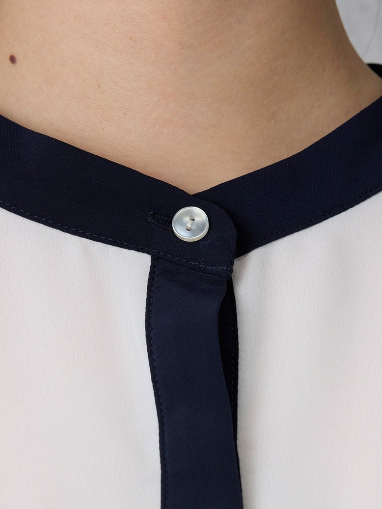 ② 衿と前たてのバイカラーデザインと衿ぐりのボタンが、シンプルながら華やかなアクセント