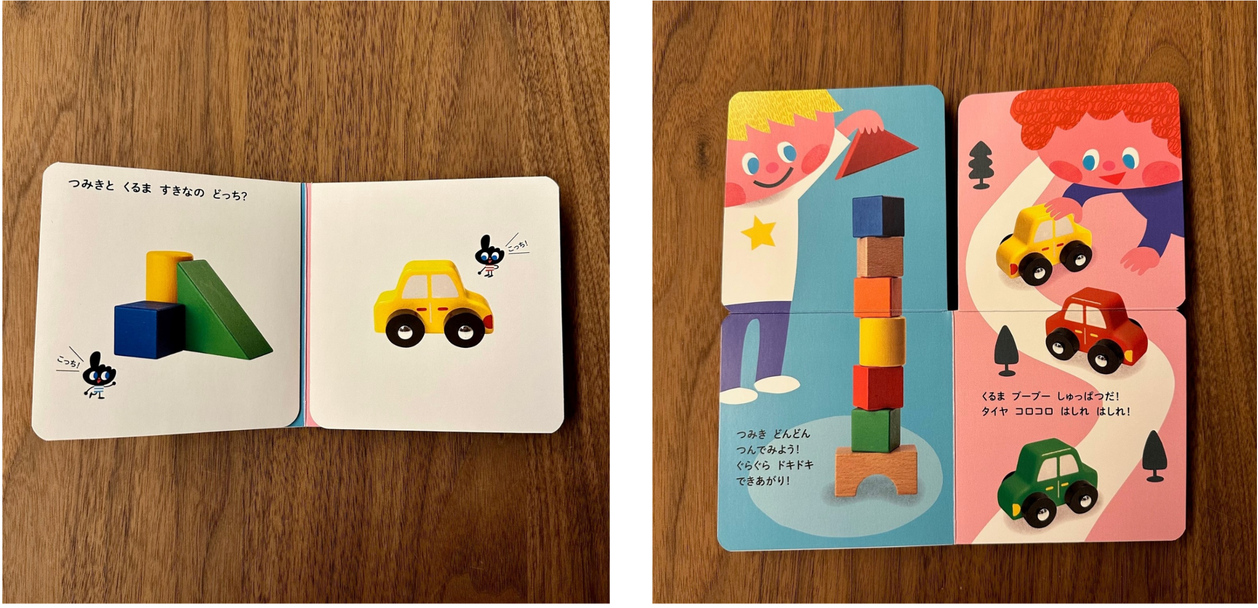 もちろん、言葉が出てきたお子さんとも同様に、「どっちかな?」とお子さんからの指さしと発語を促し、お子さん自らが物の名前を言って、親子で楽しむことができます。そして、選んだ方のページをめくると、楽しさがさらにふくらむので、お子さんの笑顔がきっと広がりますよ。