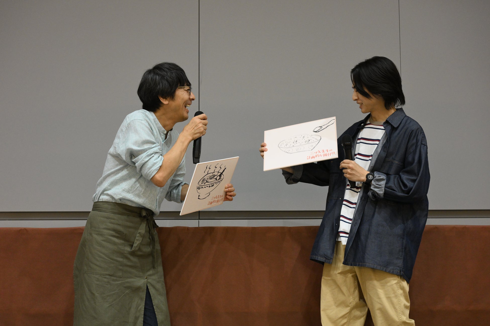 また、今回のドラマの大きな見どころのひとつ「三ツ矢先生が作る美味しい料理」について話題が及ぶと、酒井は「料理を食べるシーンがたくさんあったんですけど、どれも原作からの再現度がとても高くて。フードスタイリストさんが、原作からそのまま映像化されたような料理を作ってくださっていて、食べることが出来て幸せでした。」と実際に食べていた料理の美味しさを語った。一方、今回は料理を作る側だった山崎が、普段の料理について聞かれると、「簡単なものなら作りますよ。ペペロンチーノなどのパスタや炒飯も。これだけは嫁より上手いと思います!なので、この2品はうちの妻は作らないんですよ、僕に負けてしまうから。」と話し、笑いが起こった。
