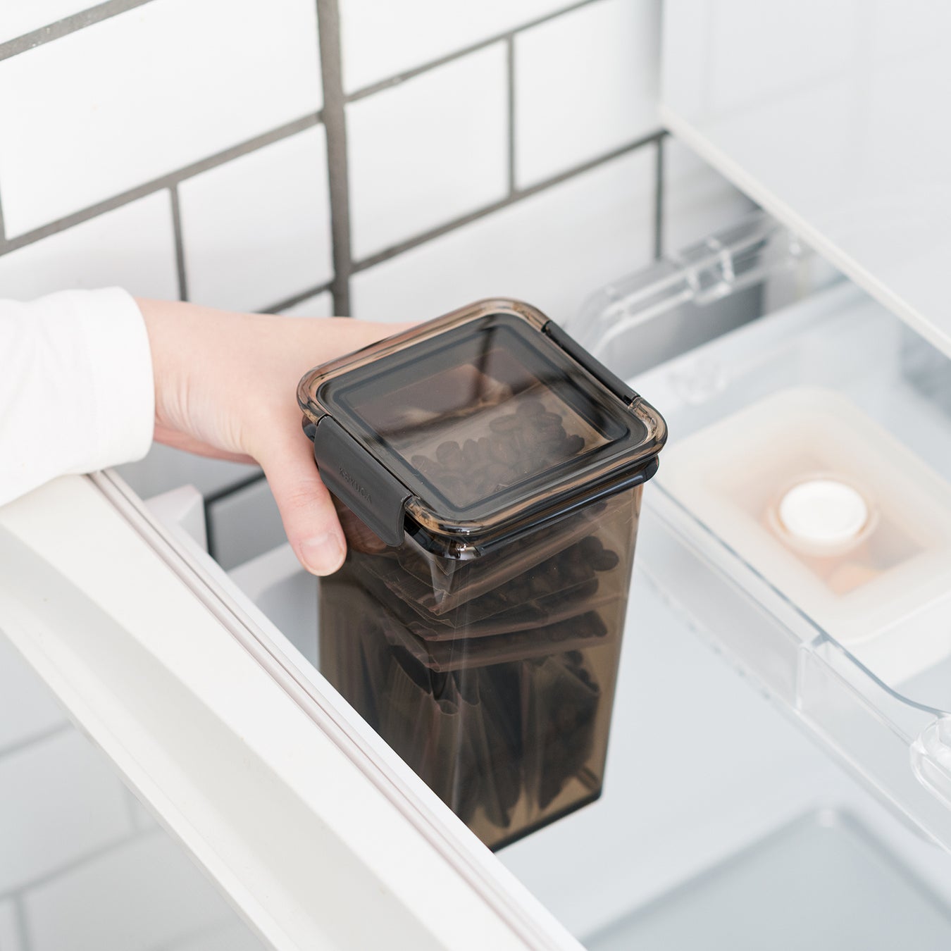落ち着いたコーヒーカラーで、横からも上からも中身が見え、四角形状なので冷蔵庫収納時もすっきり。コーヒー豆以外にも紫外線に弱い茶葉やナッツ類の保存にもおすすめです。