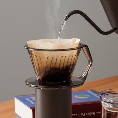 軽量で割れにくい、プラスチック製の1~4人用のコーヒードリッパーです。ドリップ量が一目でわかり、安定して美味しい味を抽出できます。使いやすさと持ちやすさ、洗浄のしやすさを研究して開発された形状のため、使用後や乾燥時、持ち手を下にして立てられます。水切れがよく、衛生面でも安心。1~4杯用の台形フィルターに対応しています。