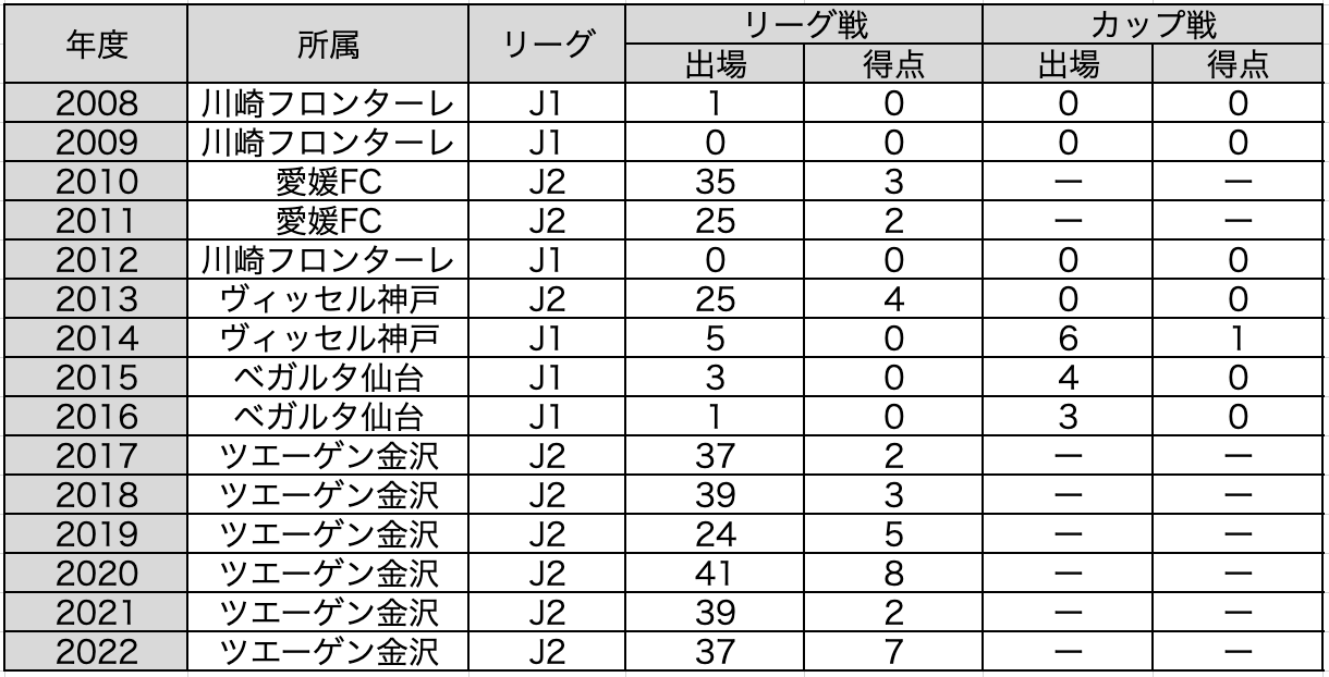 FC雄踏 - 静岡学園高校 - 川崎フロンターレ - 愛媛FC - 川崎フロンターレ - ヴィッセル神戸- ヴィッセル神戸 - ベガルタ仙台 - ツエーゲン金沢
