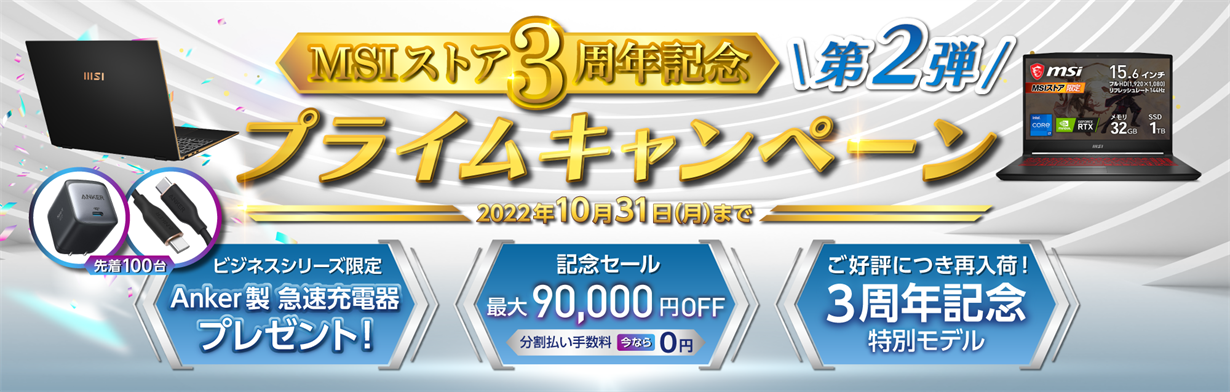 『MSIストア3周年記念 プライムキャンペーン 第2弾』では、先着100台限定で対象のMSIビジネス&ライトクリエイターノートPCをご購入いただいた方にAnker製 急速充電器をプレゼントするほか、最新モデルを含む対象ノートPCが通常販売価格より最大90,000円OFFで販売する記念セールや分割払い手数料無料キャンペーンを実施いたします。