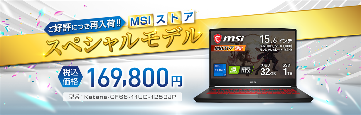 第1弾の開催と併せて発表・発売し、多くのお客様にご好評いただいていたMSIストア3周年記念スペシャルノートPC「Katana-GF66-11UD-1259JP」の再入荷が決定いたしました。