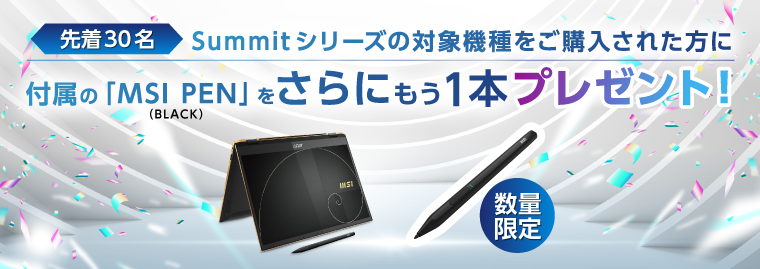 さらに、上記対象商品のうち、Summit シリーズをご購入の先着30名様に、アクティブスタイラス「MSI Pen(Black)」を1本追加プレゼントいたします。