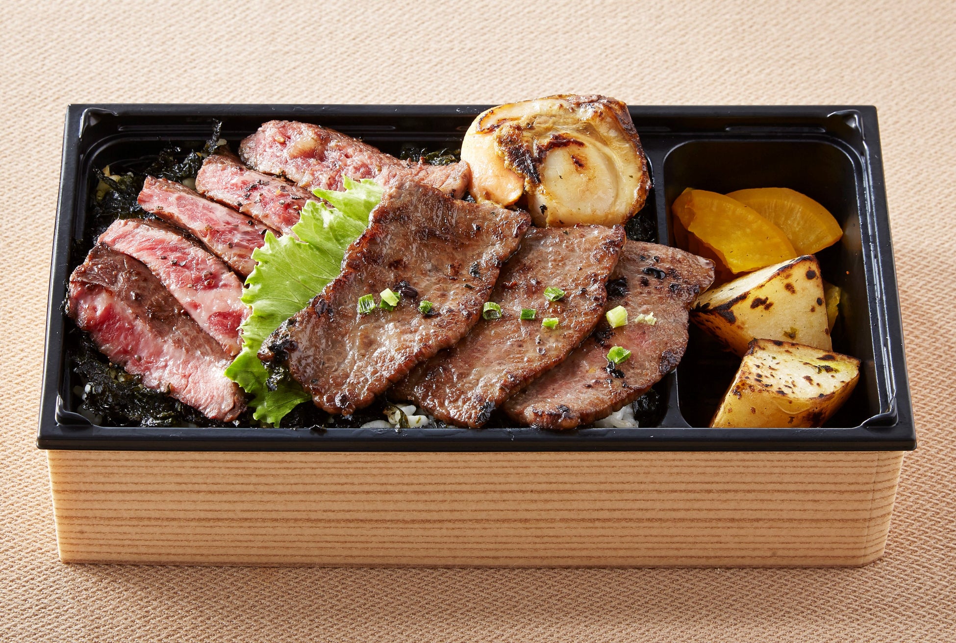 北海道産和牛のランプステーキとイチボの二種盛り帆立のせ弁当