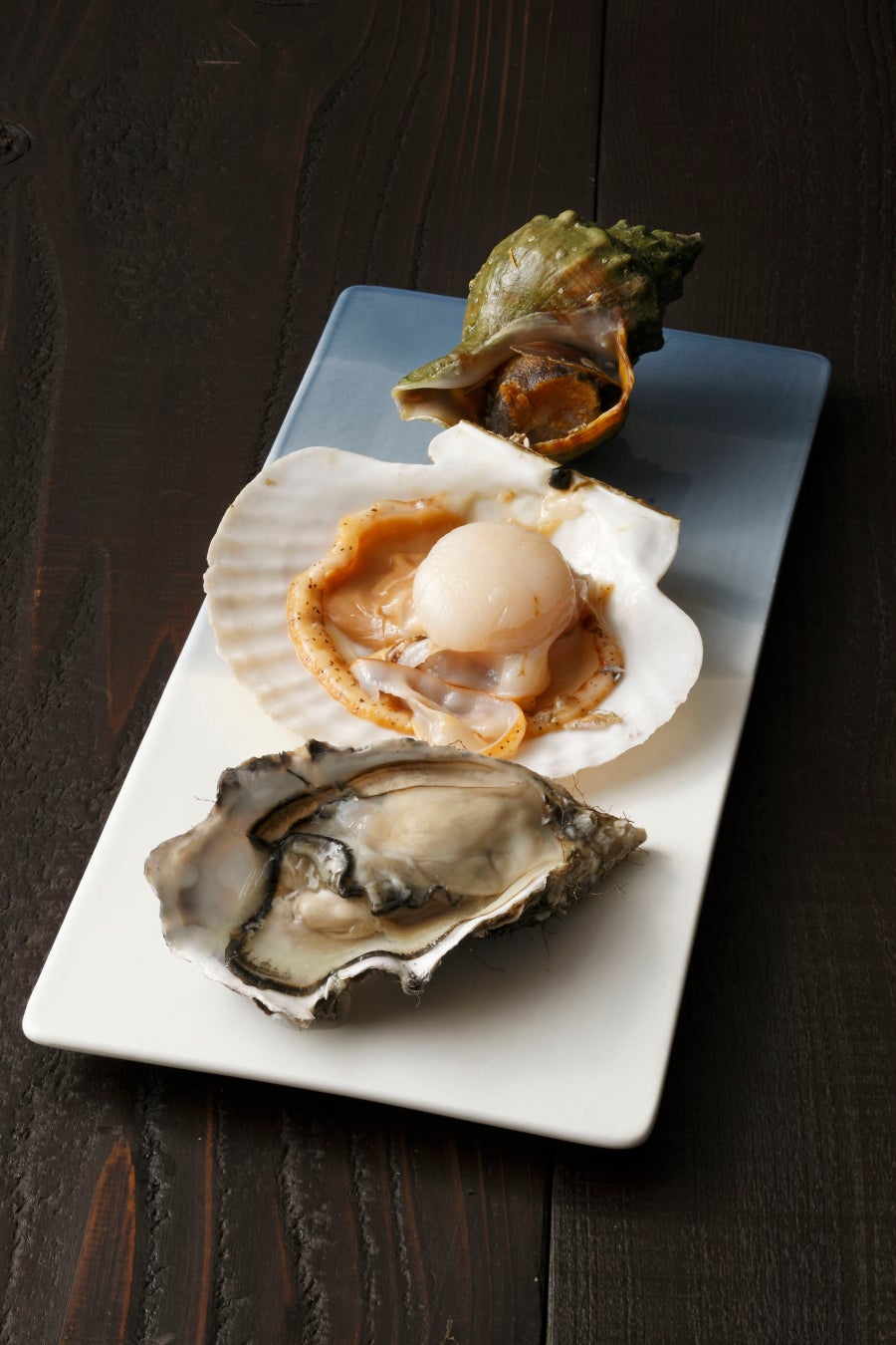 写真下)牡蠣・帆立・つぶ貝3種食べ比べ(1皿、各1個)1,300円