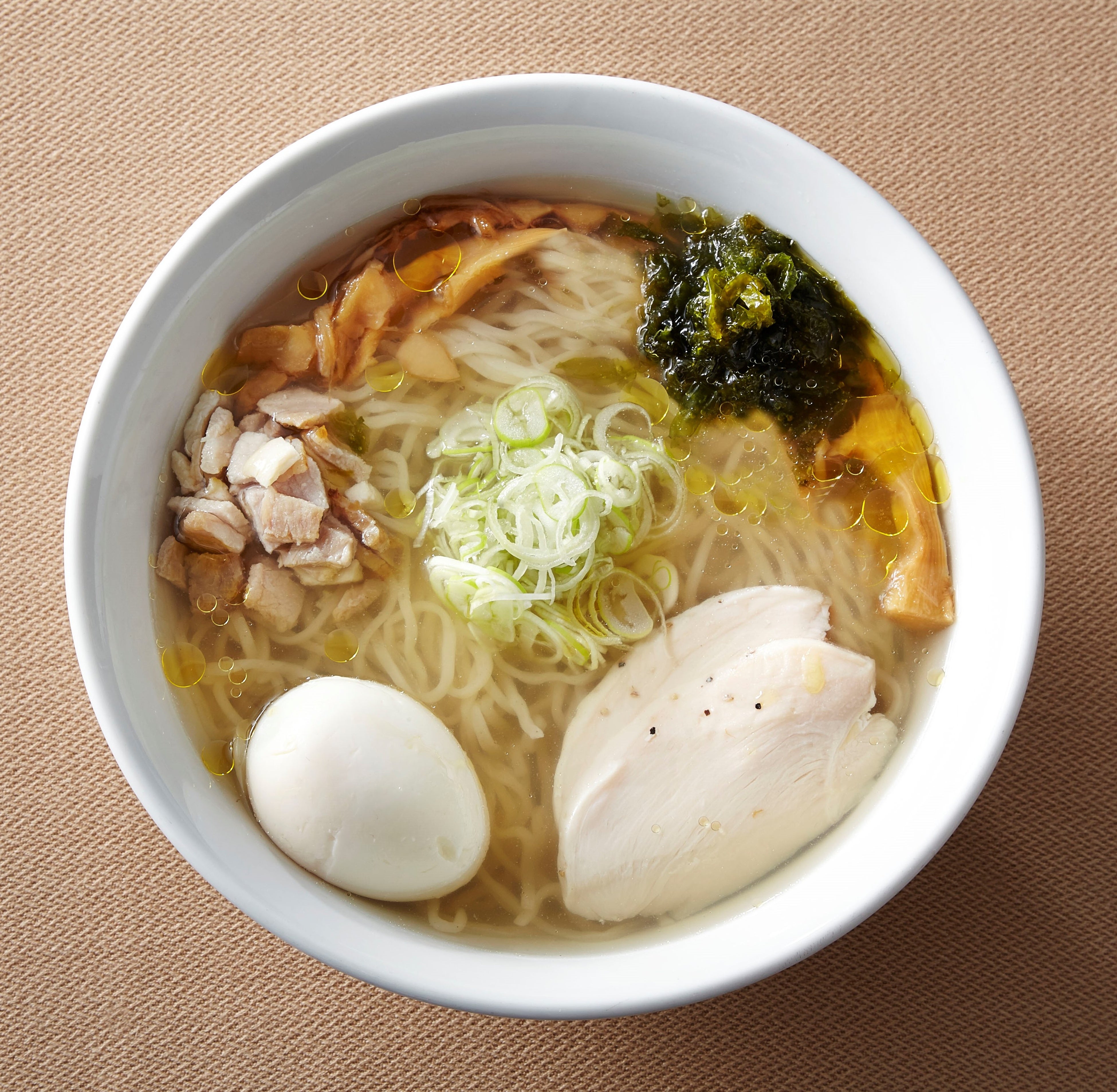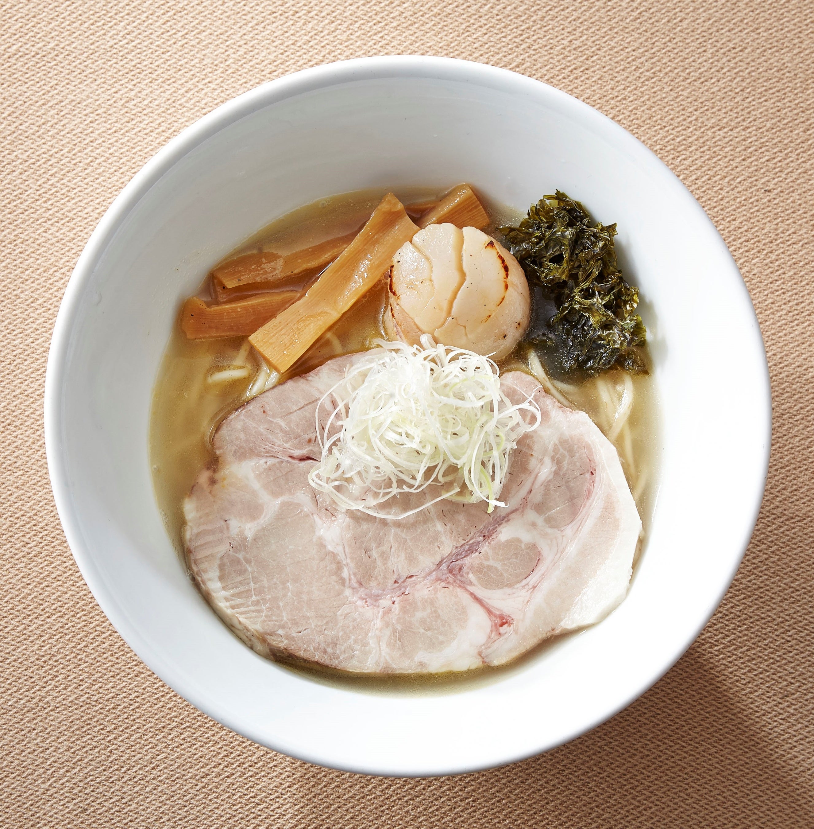 帆立、羅臼と利尻の昆布でだしをとった塩ベースのスープは、濁りのないやわらかなおいしさです。鶏チャーシュー、ゆで卵、地海苔をトッピングして、ボリュームたっぷりの1杯に。