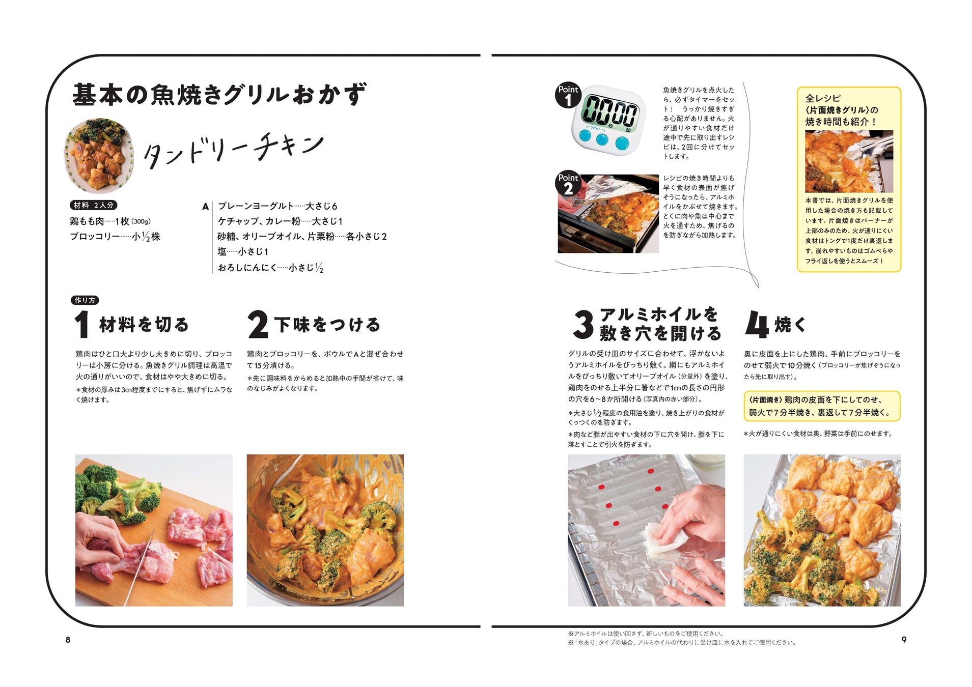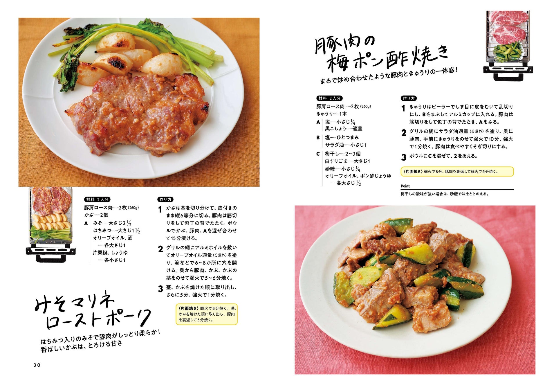 肉や魚などの主菜だけでなく、野菜を使った副菜も同時に作れるレシピを紹介しています。漬け汁に肉と野菜をからめて一緒に焼いたり、味付けを変えた野菜をアルミカップに入れて焼いたり、グリル中にサラダを作ったり。献立に悩むことなく段取りよく作れるので、時間がないときでも大助かり!