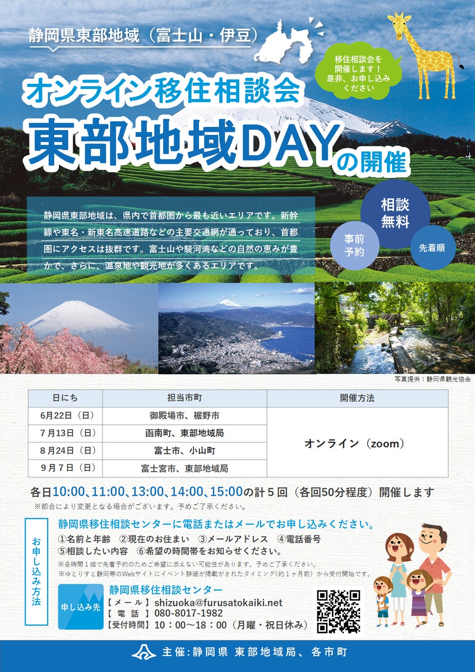 オンライン移住相談会「静岡県東部地域DAY(御殿場市・裾野市)」を6月22日(日)に開催します。御殿場市・裾野市の職員がじっくり相談を受付けますので、少しでも興味のある方は是非お申込みください。
