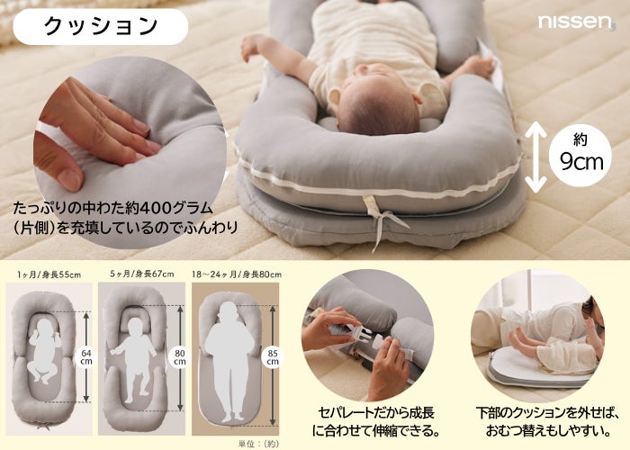 カバーは綿100%でやさしい肌あたり。クッションの中材を取り外してカバーだけでも手軽にお洗濯可能です。上下のクッションは赤ちゃんの成長に合わせて伸縮できるアジャスター付。約64~85cmまで調節可能なので、新生児から6ヶ月程度まで対応可能です。さらに、下部クッションを取り外して使えば2歳ごろまでご利用いただけます。