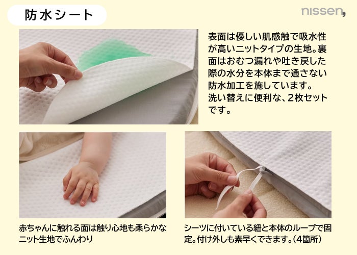 赤ちゃんに触れる表面は、優しい肌感触で吸水性が高いニットタイプの生地。触り心地も柔らかでふんわり。