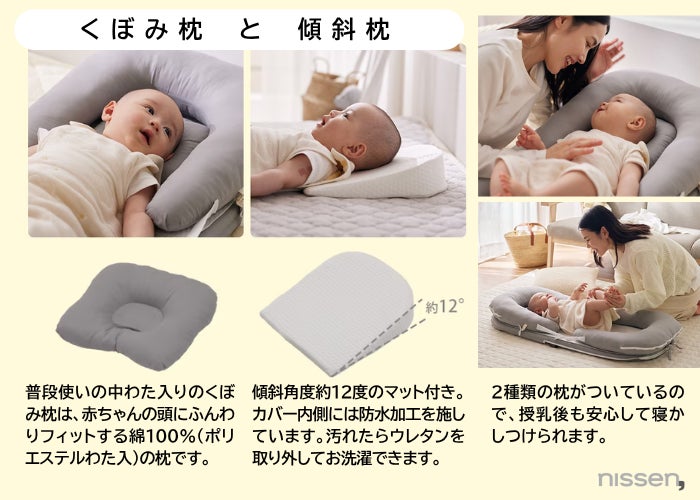 授乳後をサポートする傾斜枕とくぼみ枕付き