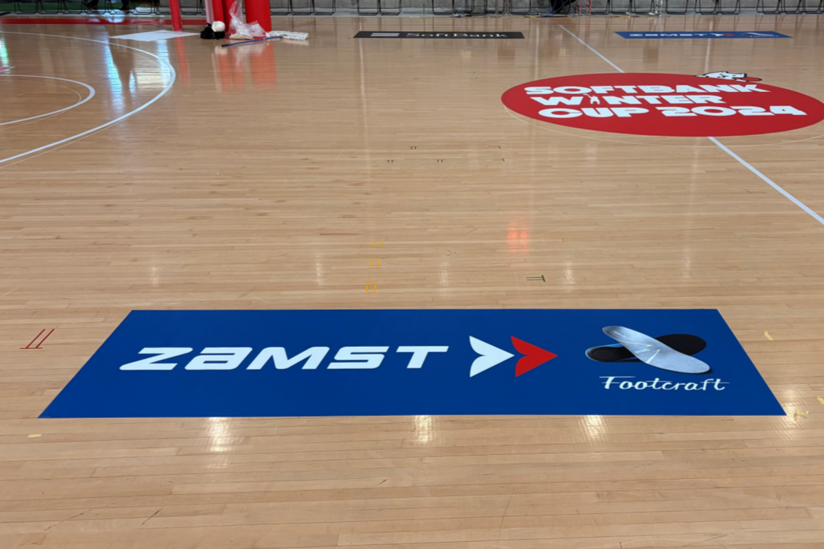 東京体育館の4つのコートのうち、ZAMSTコートは冠コートとなっており、ゴール胴体にもロゴが掲示されます。