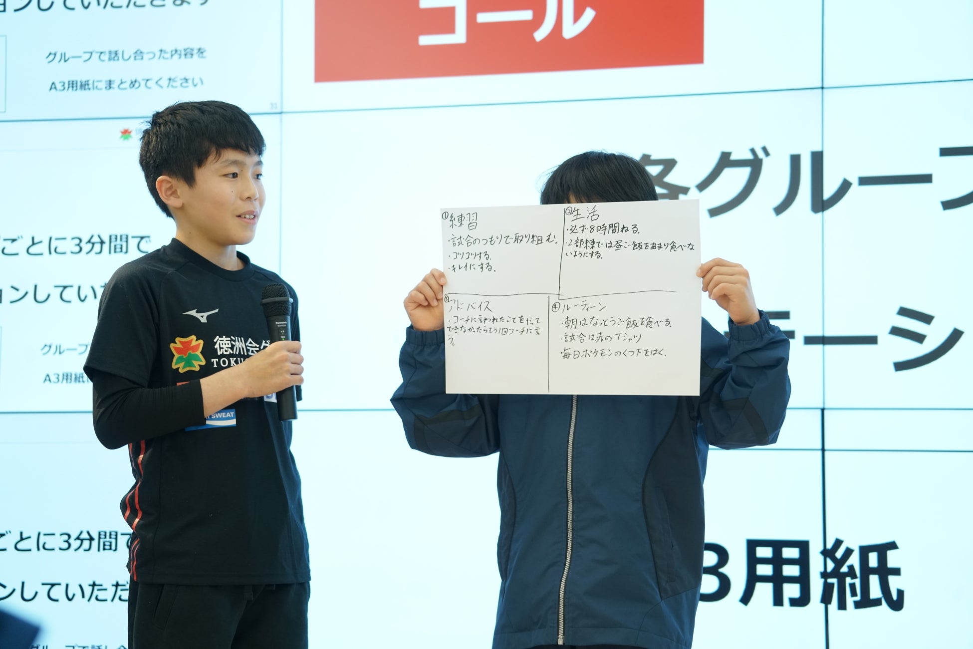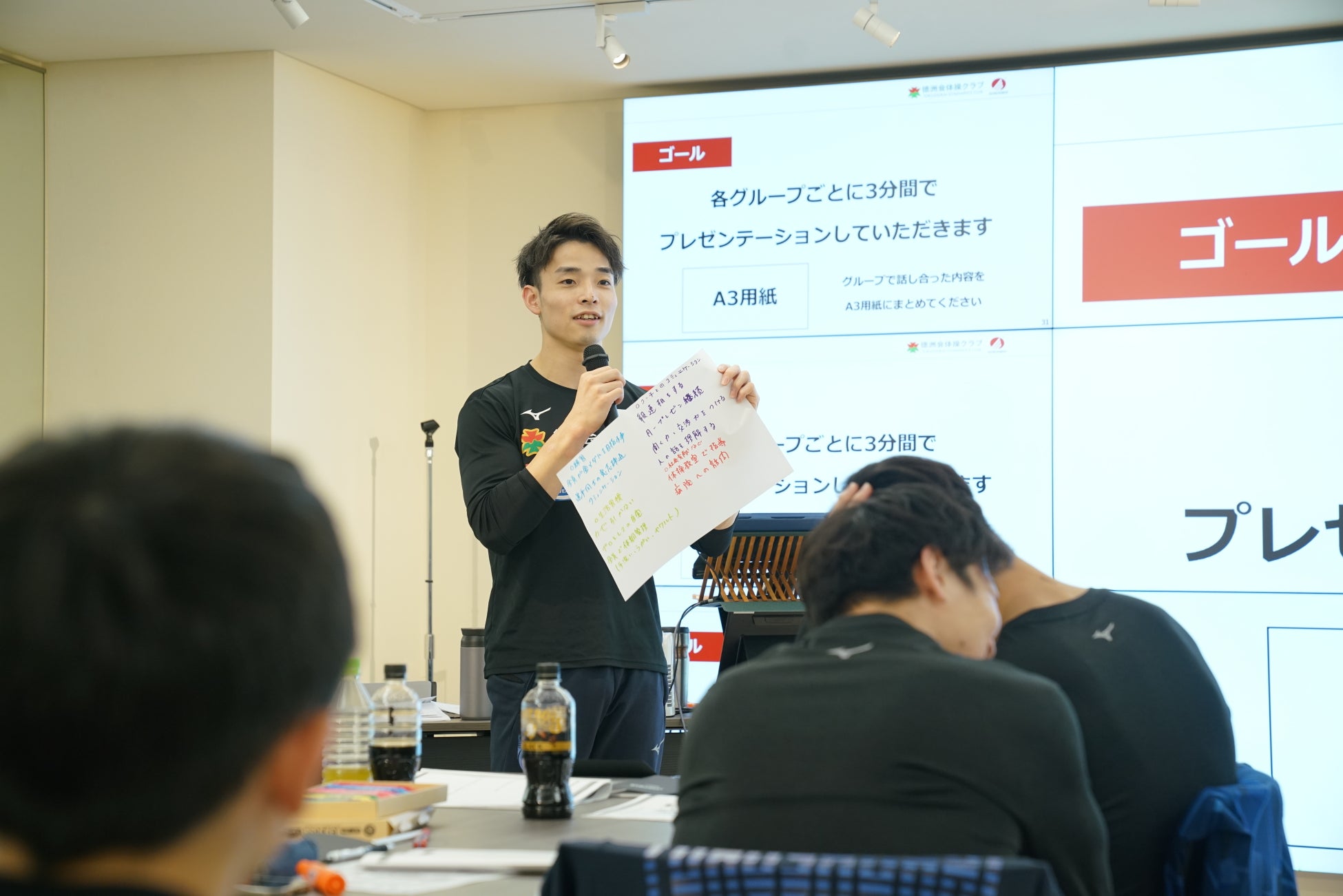 研修の総仕上げとして行われたのは、4年後のロス五輪イヤーを見据えた「自己宣言」です。2028年までに自分は何を成し遂げるのか。一人ひとりが自身のビジョンを「自己宣言文」として言語化し、全員の前でプレゼンテーションを行いました。仲間の前で自分自身の理想を宣言することで、未来へのコミットメントを固める時間となりました。