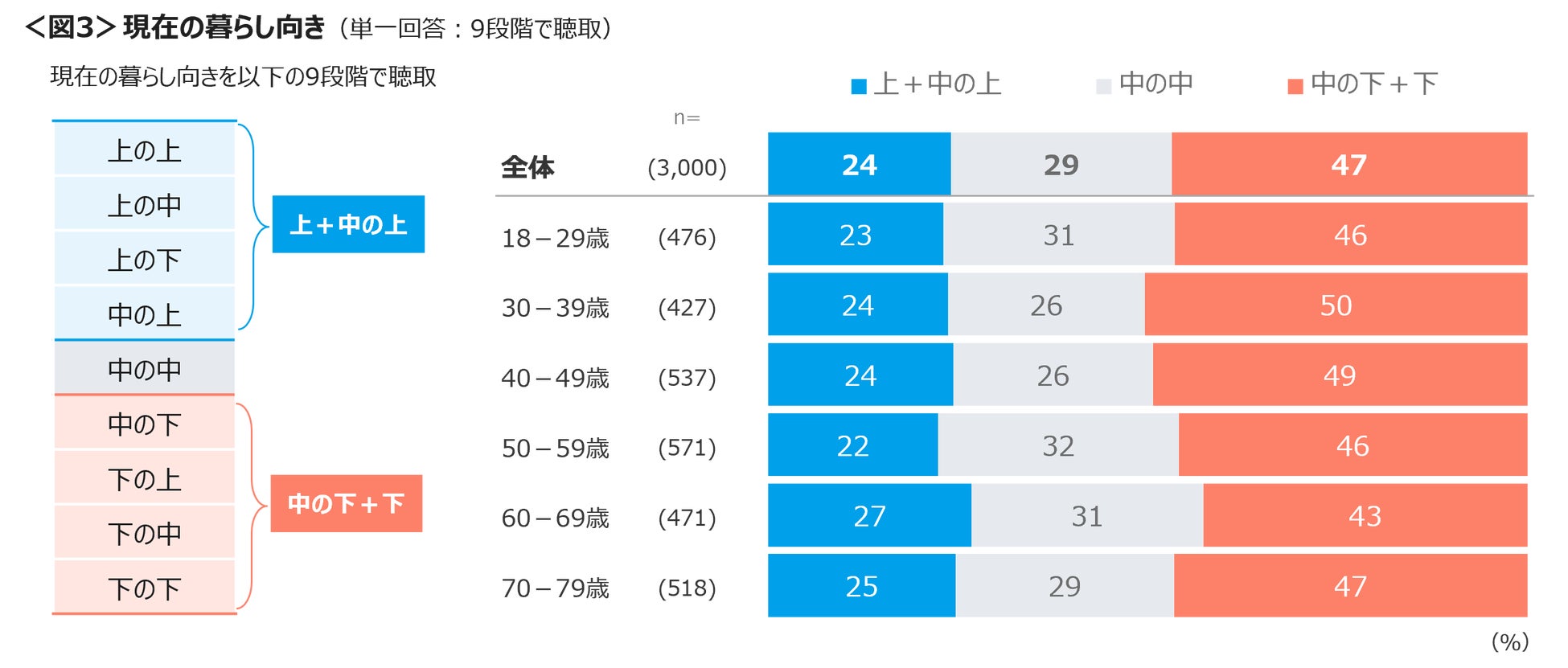 現在の暮らし向きを上中下の9段階で聴取し、3つのグループにまとめた。「中の下+下」は47%を占め、「中の中」は29%、「上+中の上」は24%であった。30代と40代は「中の下+下」が49~50%とほぼ半数を占めた。<図3>