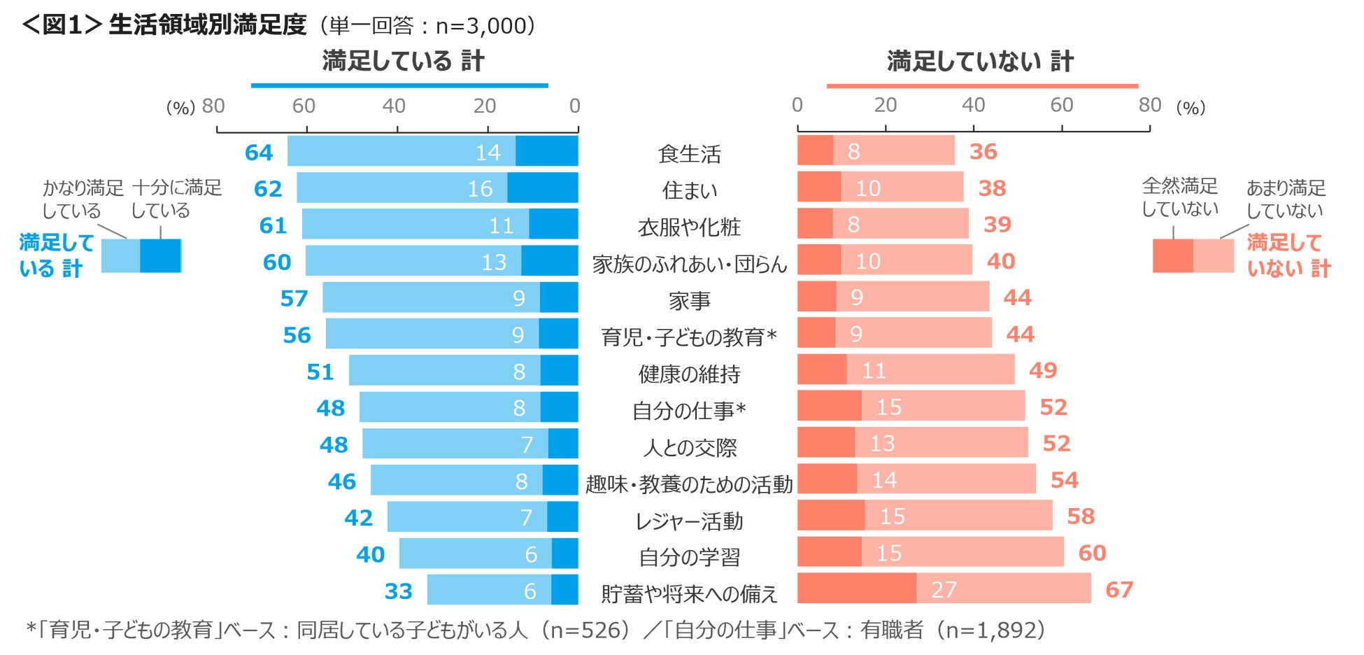 生活への満足度を項目ごとに聴取したところ、「食生活」「住まい」「衣服や化粧」「家族のふれあい・団らん」が6割台で高め。一方、満足していないが多いのは「貯蓄や将来への備え」「自分の学習」「レジャー活動」であり、特に貯蓄や将来への備えに対し「全然満足していない」は27%を占める。<図1>