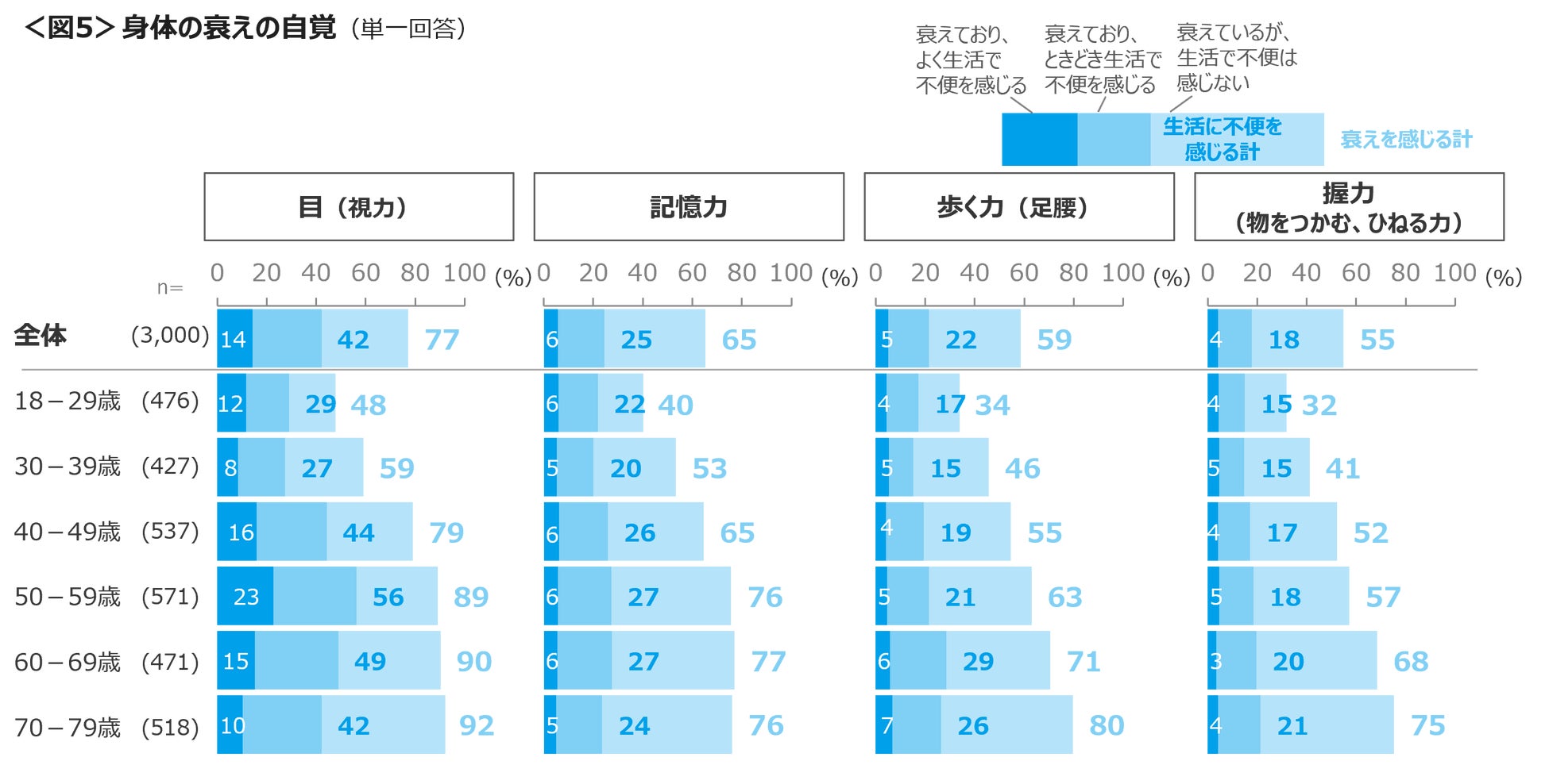 身体の衰えを自覚する年代は、30代から「目(視力)」「記憶力」、40代から「歩く力(足腰)」「握力(物をつかむ、ひねる力)」で半数を超えた。特に目は50代から半数以上が生活に不便を感じるまでに達する。<図5>