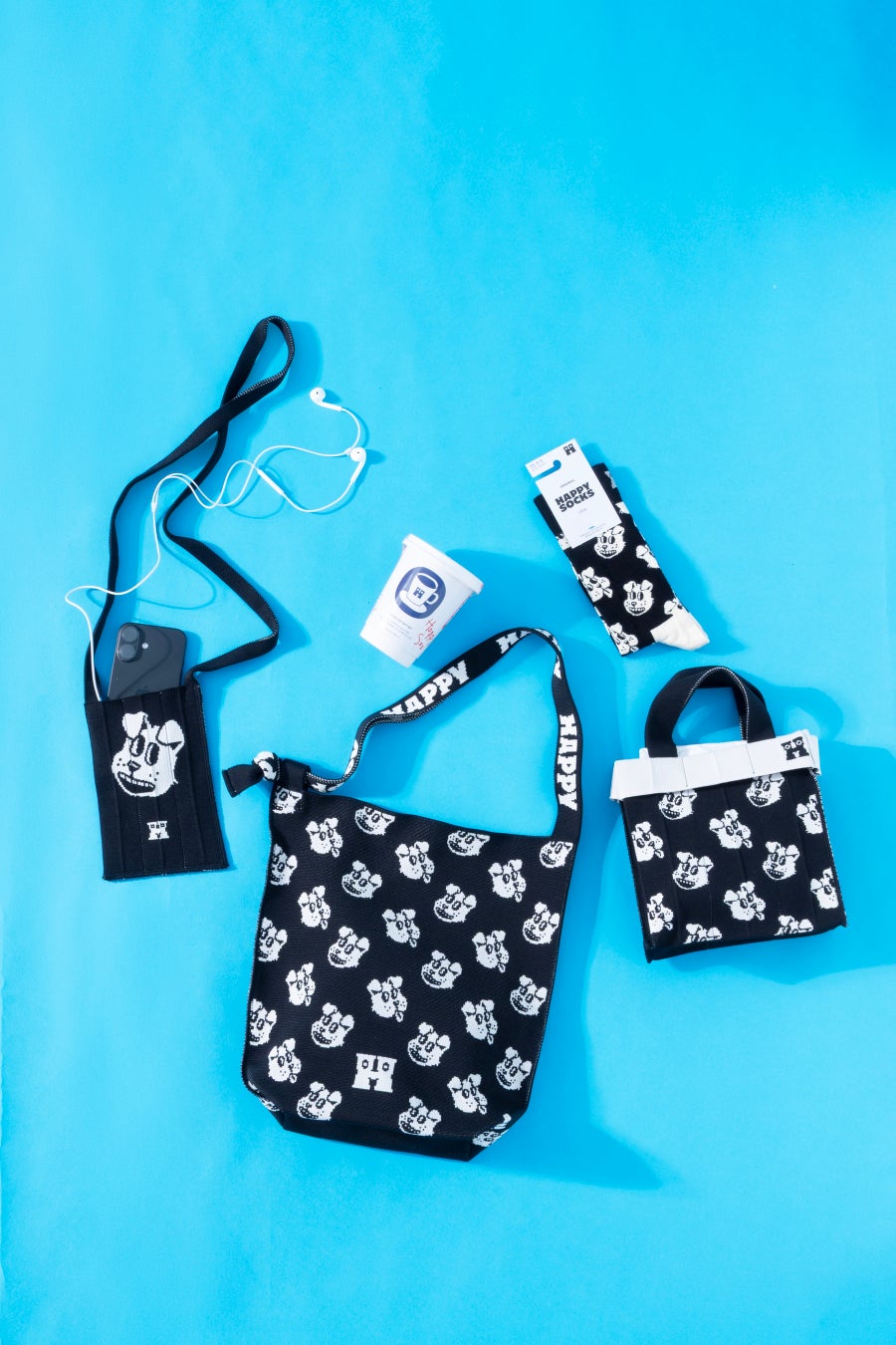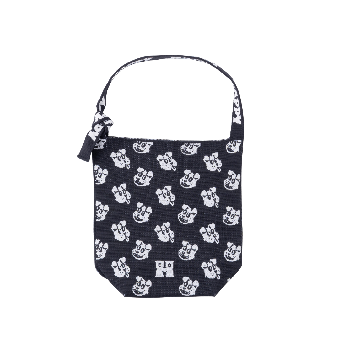 特殊な編み方で自立するタフな設計。マチ付きで荷物をしっかり守る便利なサイズです。他のシリーズとは異なる凹凸のある豊かな編み地が特徴で、靴下で人気のキャラクター総柄が立体的に映えるデザイン。ストラップ部分には「HAPPY」のタイポグラフィがあしらわれ、肩掛けした際にもキャッチーな印象を与えます。