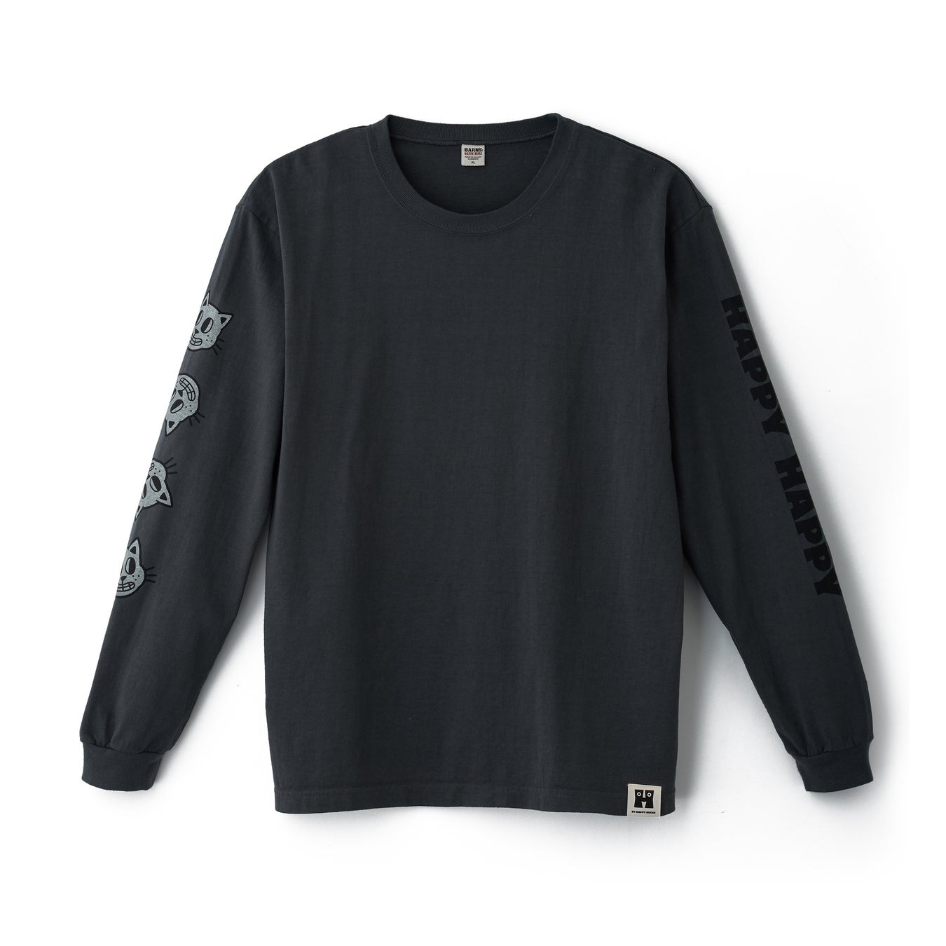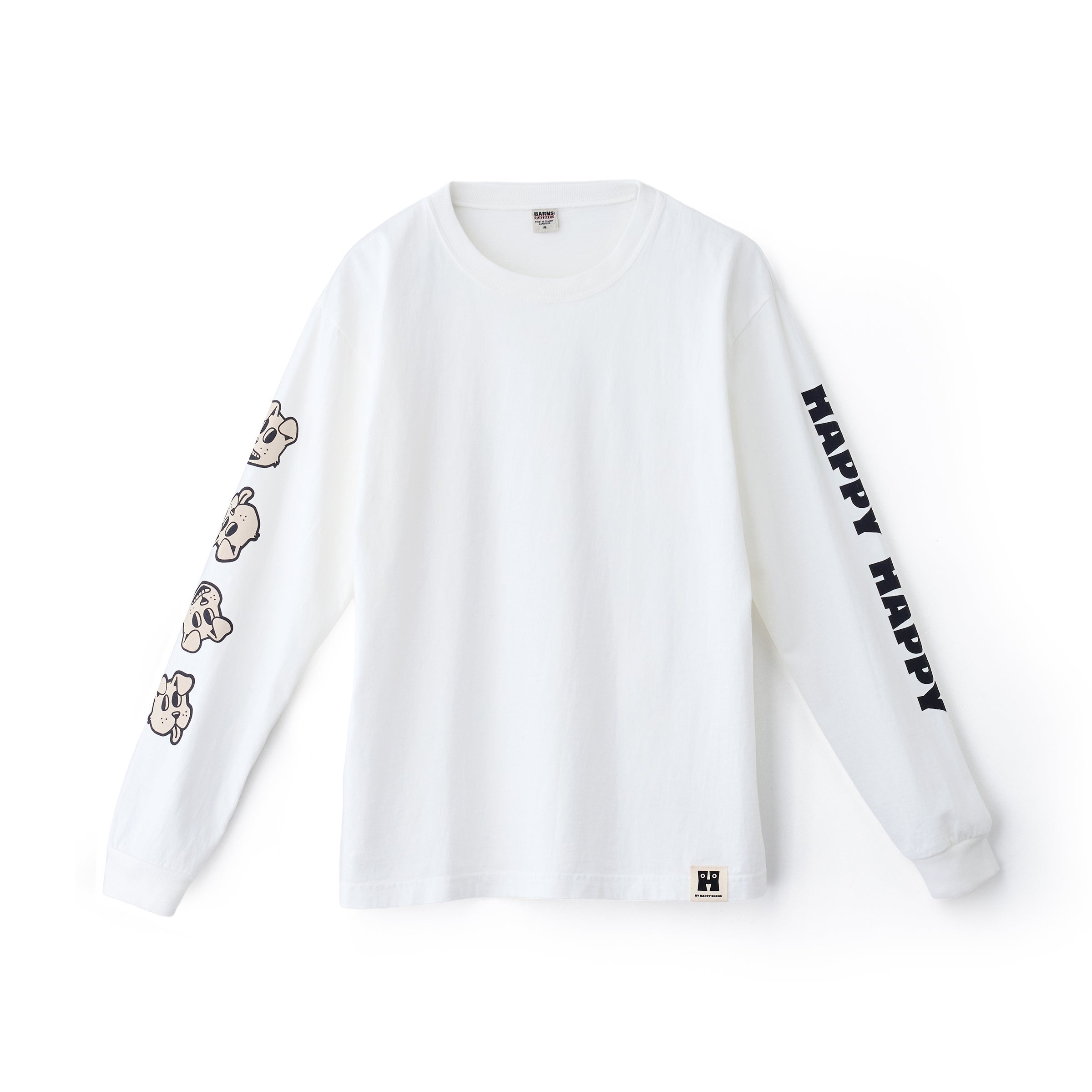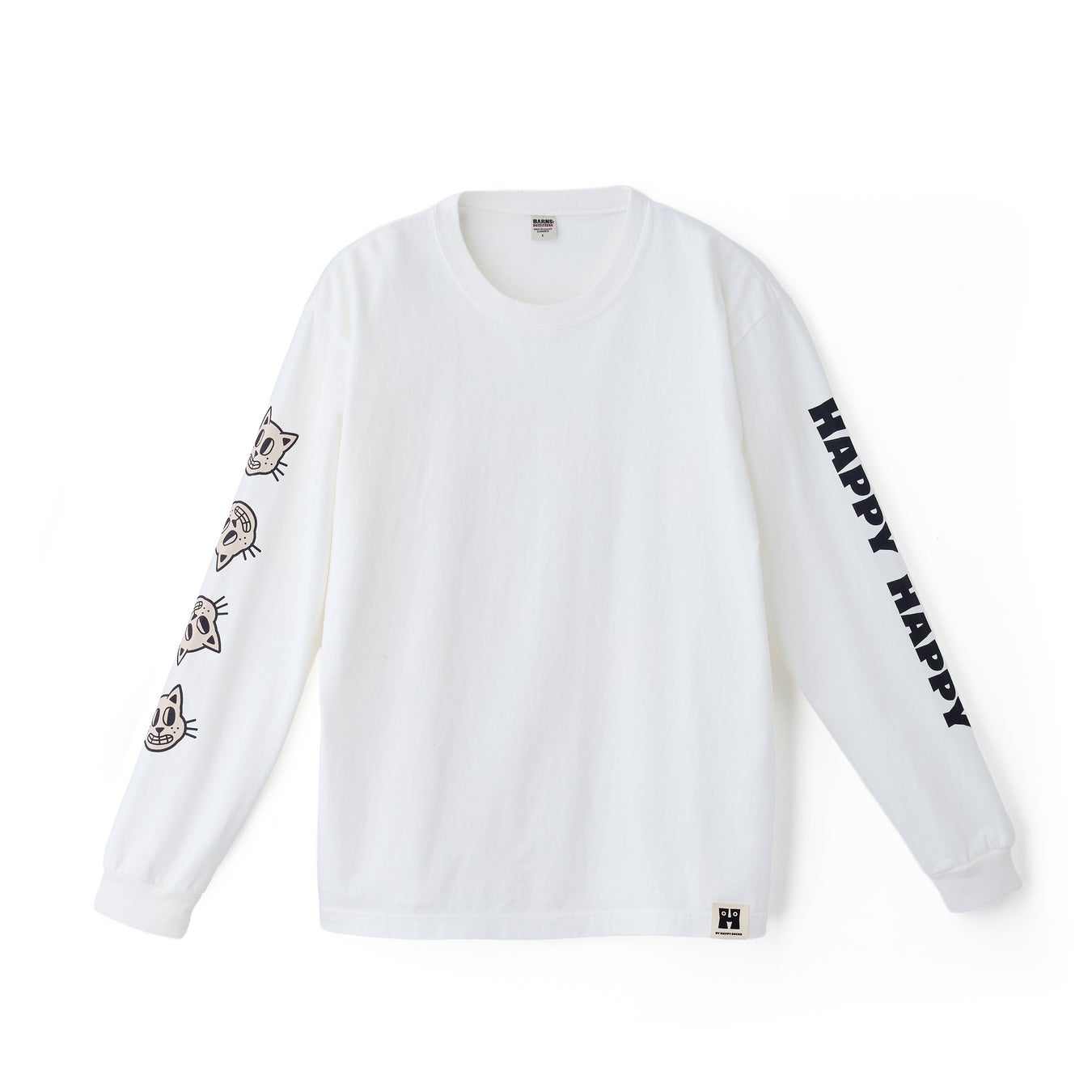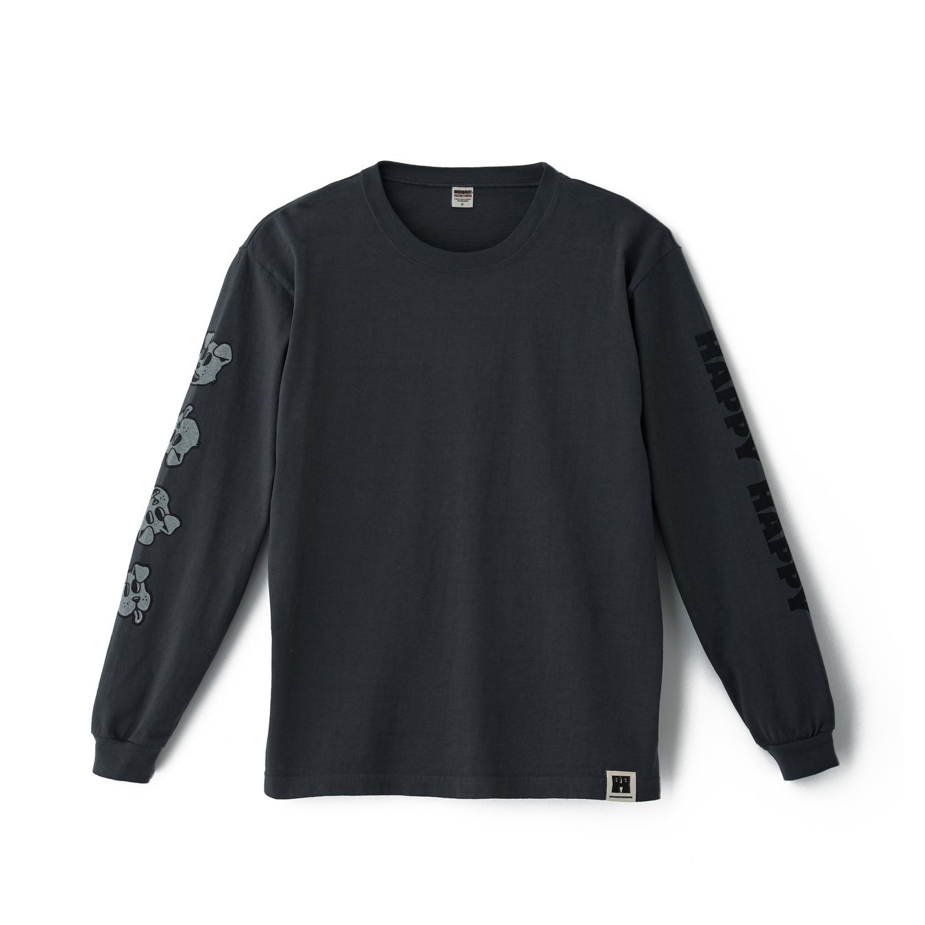 Long-sleeve T-shirtは、右袖にはDogやCatの愛くるしい表情を並べ、左袖には「HAPPY HAPPY」のタイポグラフィを大胆にプリント。DogとCatの2デザインで、それぞれWhite、Sumikuro、Blueの3色を展開します。裾部分にはHロゴのワンポイントタグを配し、細部までこだわりを詰め込みました。