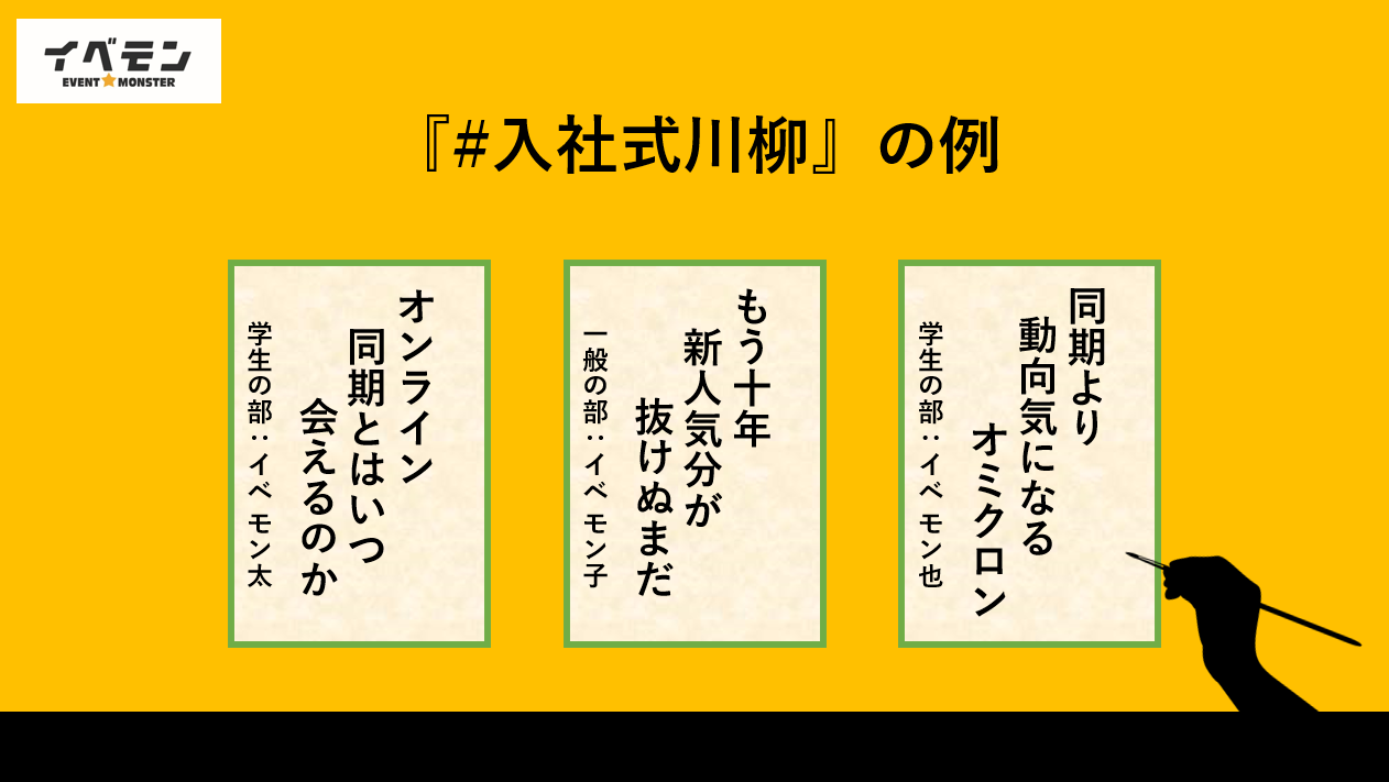 そこで、今般イベモンでは、対面、オンライン・ハイブリット型に関わらず入社式に携わる全ての方々の想いを川柳にして多くの方に知っていただきたく、「入社式川柳」の募集を開始することといたしました。