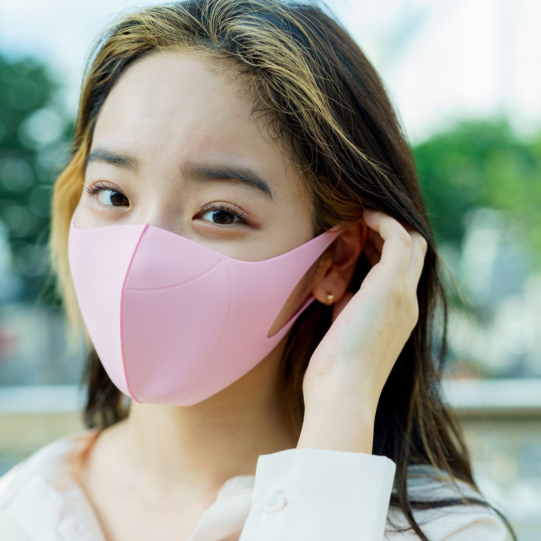 メイクパフ素材でできた極上肌触りとウレタンマスクの常識を超える高い飛沫捕集効率のマスク。