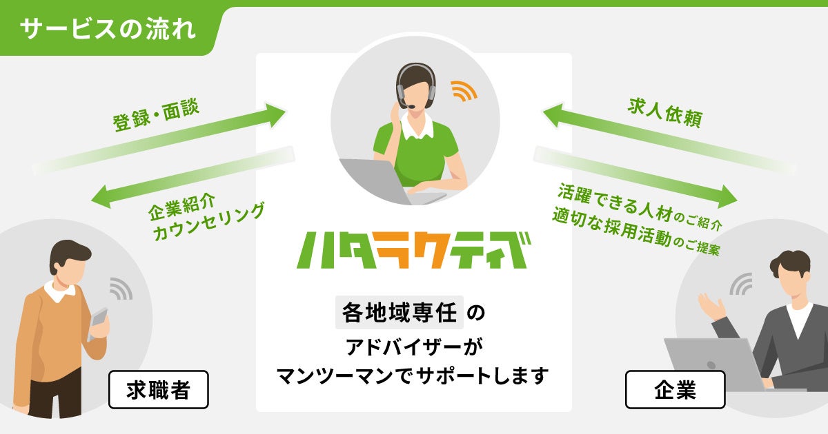 求職者と企業へ地域専任のアドバイザーによるスマホ・PCでのオンライン相談を実施し、ご相談からご提案まで一気通貫で、オンラインで完結する就業支援サービスです。地方における利便性に着目し、交通の便によってサービス利用が難しくなる地域間格差を是正すべく、オンラインでのサービスの提供エリアを拡大するに至りました。